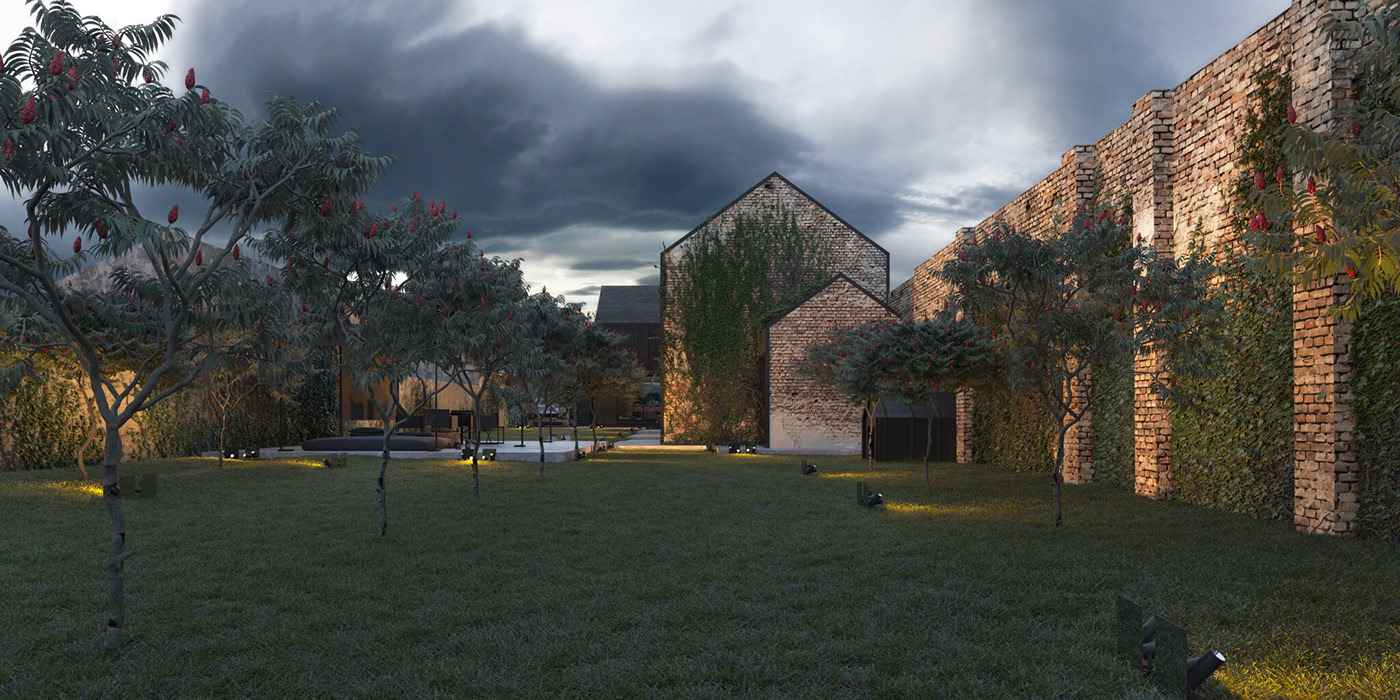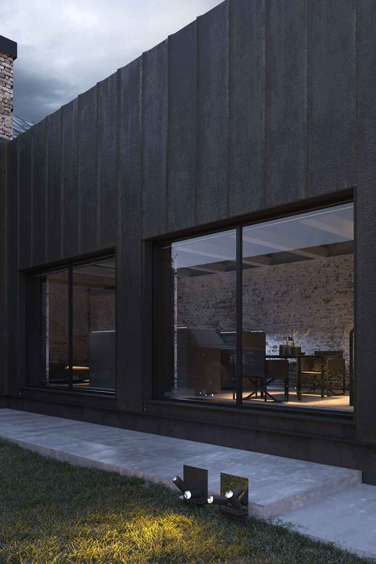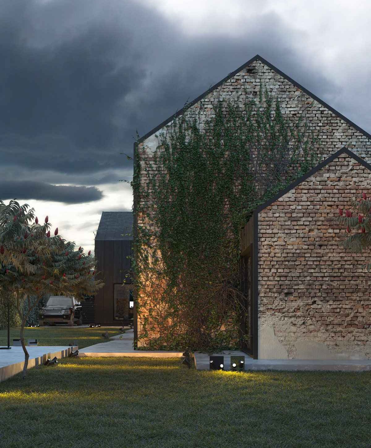 Punktowe oświetlenie zewnętrzne subtelnie podkreśla strukturę cegły oraz oplatający ją bluszcz, tworząc nastrojową atmosferę po zmroku. Efekt końcowy to elegancka, nowoczesna przestrzeń, w której tradycja spotyka się z minimalizmem, a starannie zaprojektowane detale czynią budynek niepowtarzalnym przykładem udanej modernizacji.