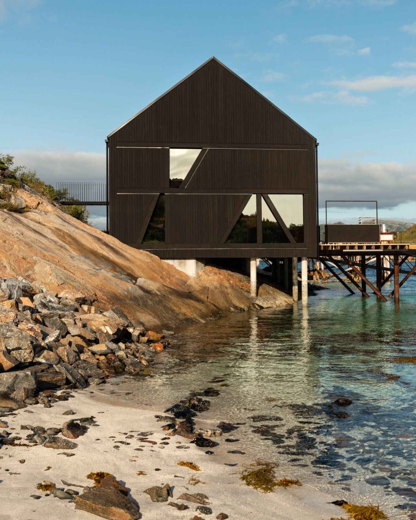 Naustet Stokkøya Boathouse to wyjątkowy dom położony na skalistym brzegu Norwegii, gdzie surowe, nordyckie otoczenie spotyka się z eleganckim minimalizmem i funkcjonalnością skandynawskiego designu. Projekt łączy w sobie tradycyjny charakter dawnych hangarów na łodzie z nowoczesnym podejściem do architektury. Fasada budynku została wykonana z desek świerkowych pokrytych olejem lnianym, co nadaje jej głęboki, naturalny odcień i doskonale wtapia dom w otaczający krajobraz. To przykład, jak nowoczesna stodoła może współistnieć z naturą, nie tracąc przy tym elegancji ani prostoty.