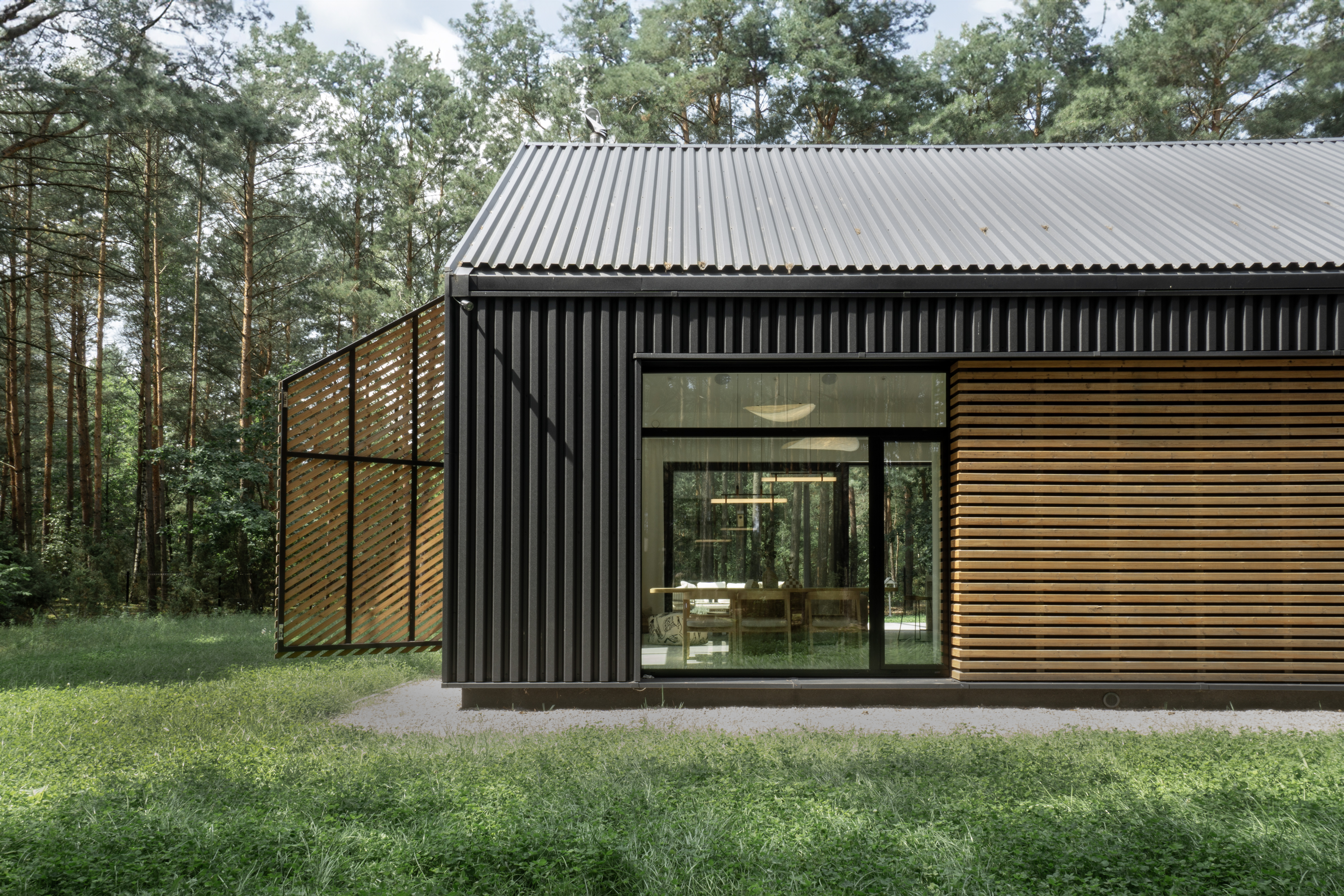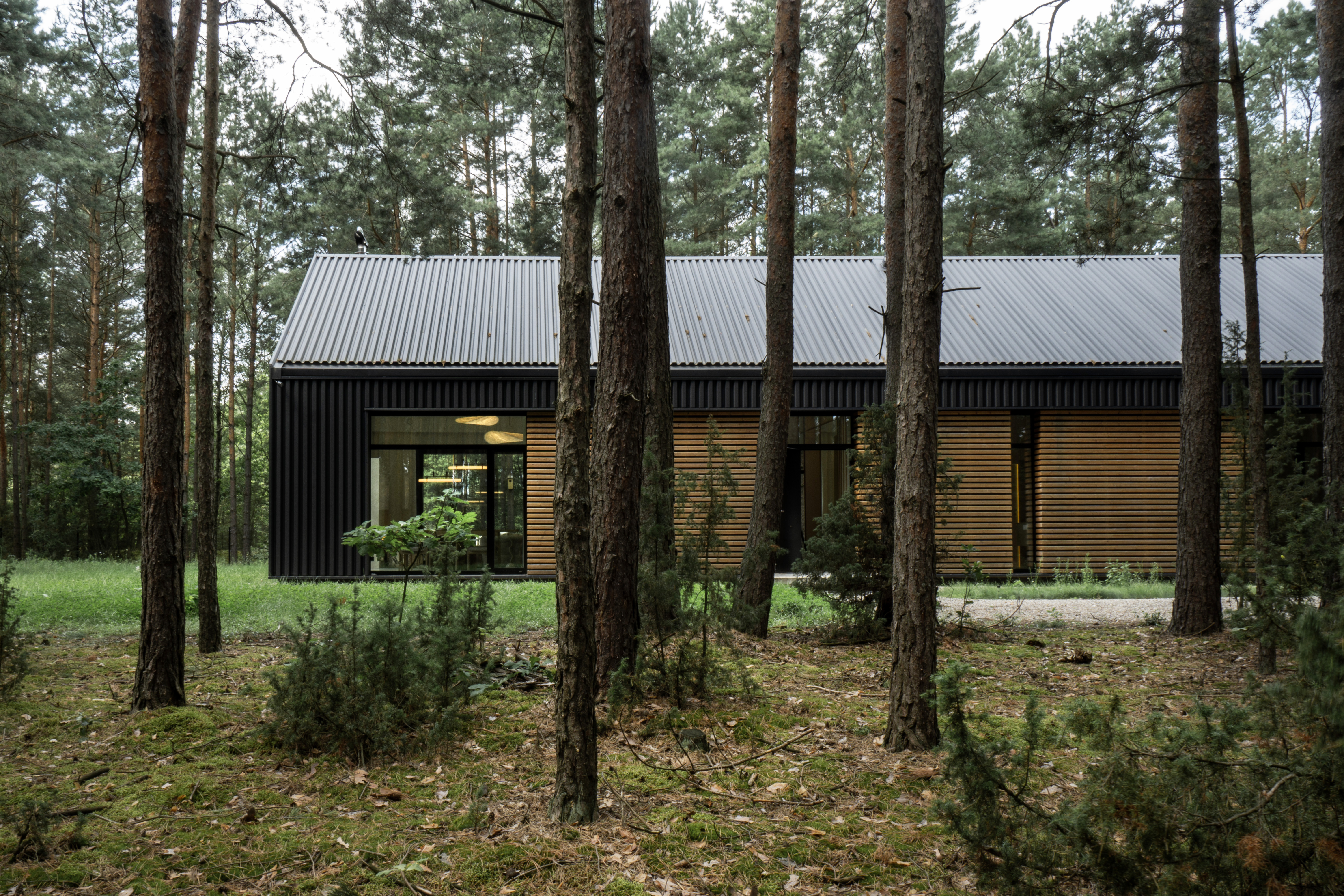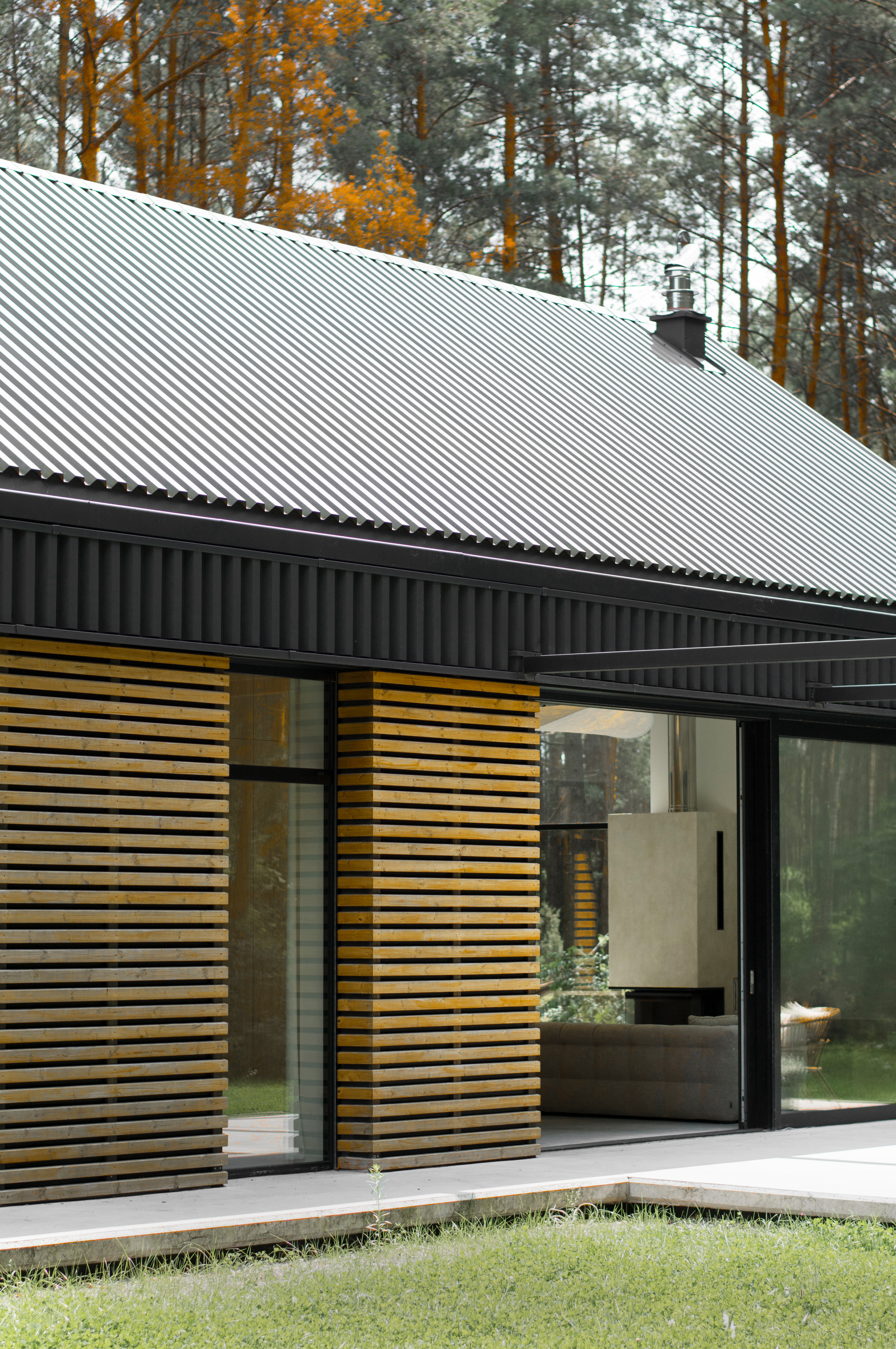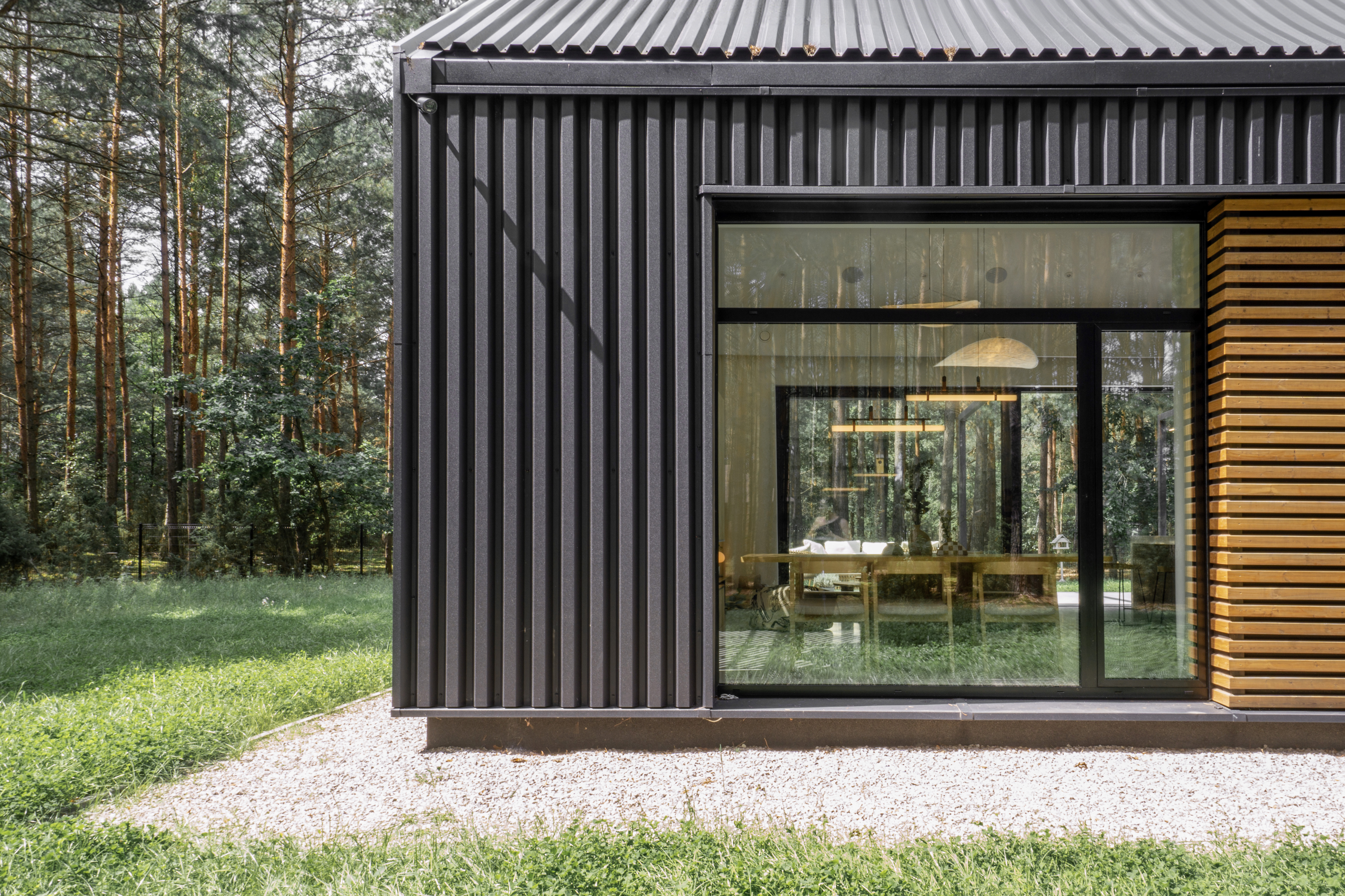 Elewacja i dach zostały wykończone z blachy trapezowej w czarnym odcieniu. Jako kontrast dla głębokiego odcienia blachy, wprowadzono akcenty w postaci termicznego drewna sosnowego na elewacji.