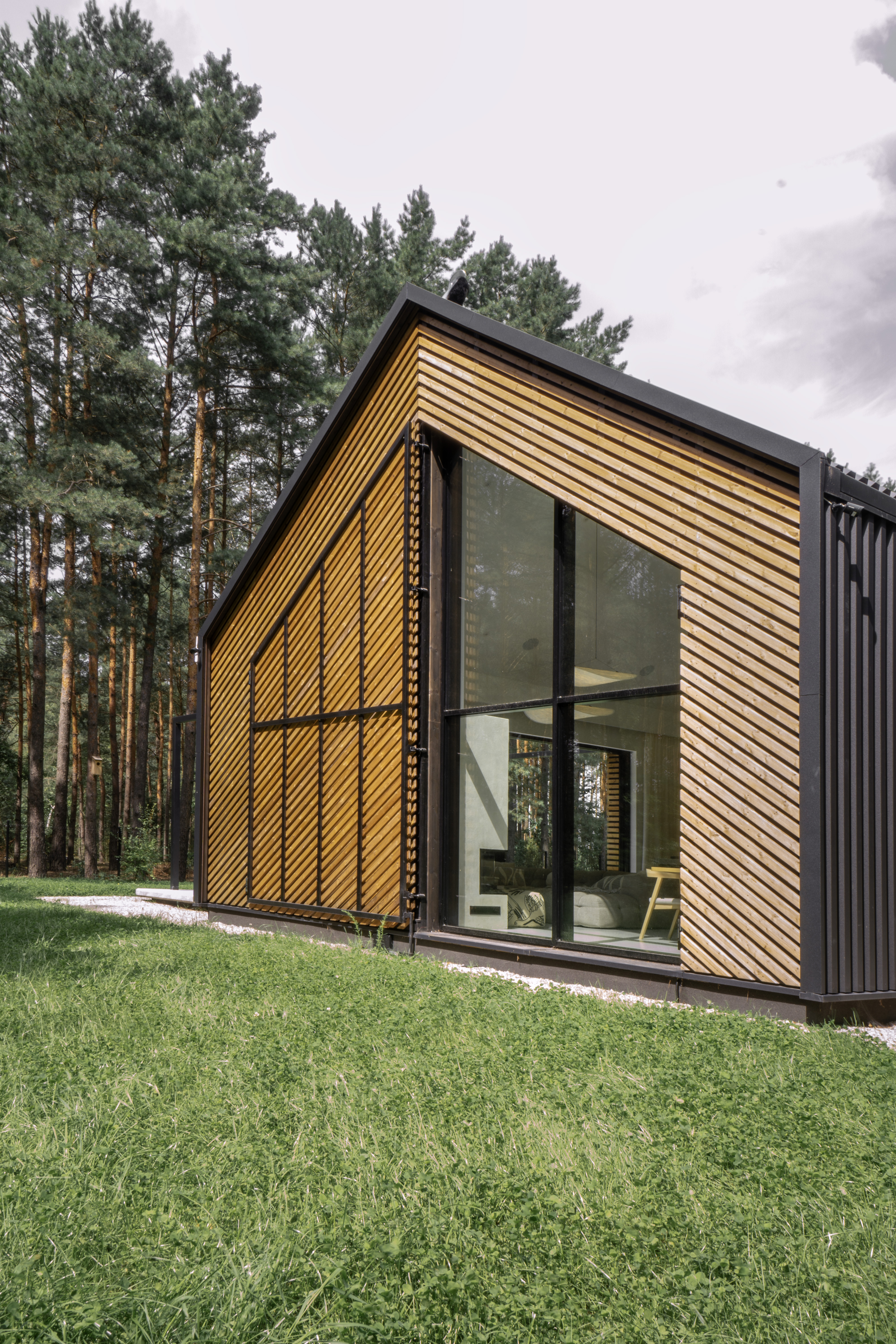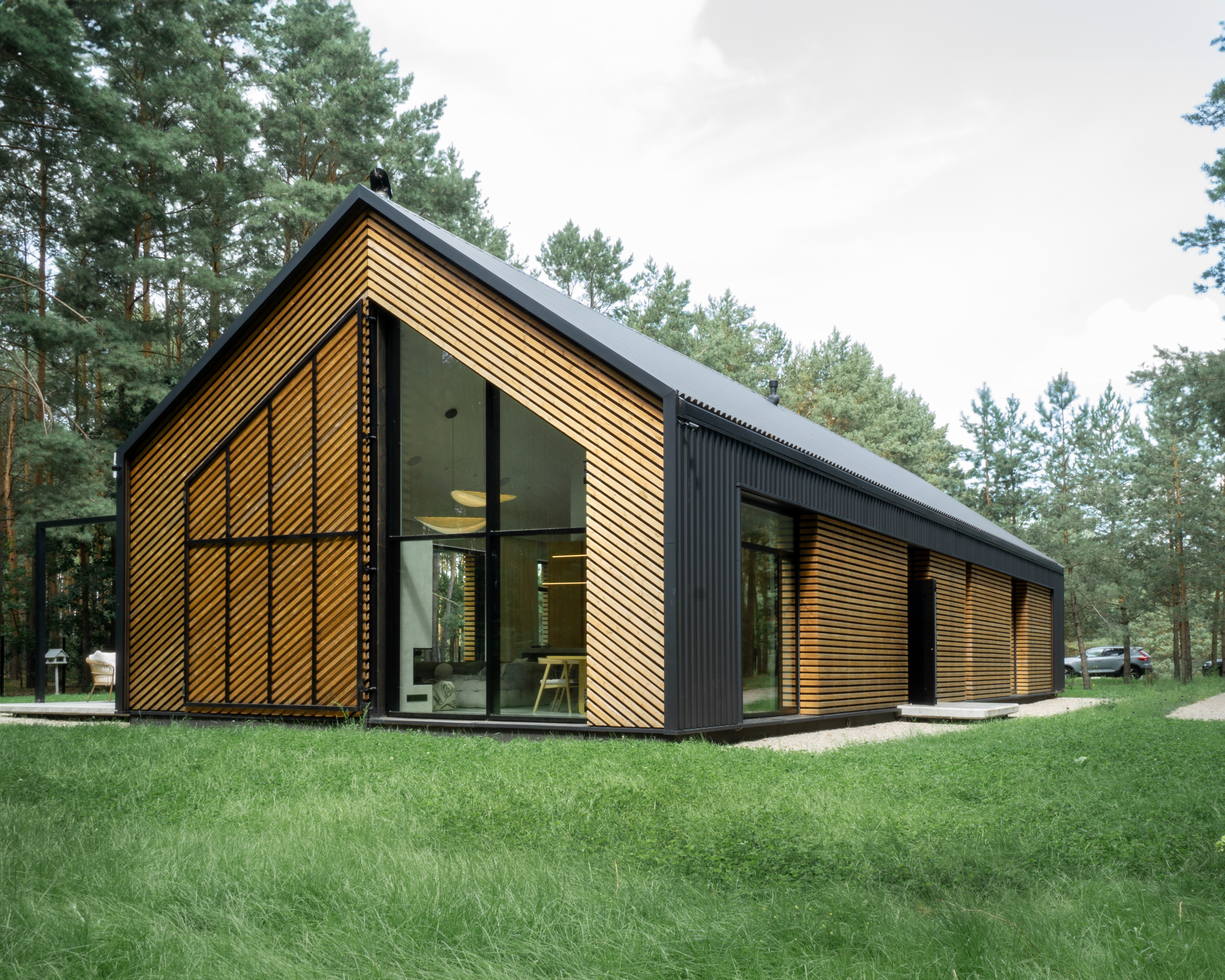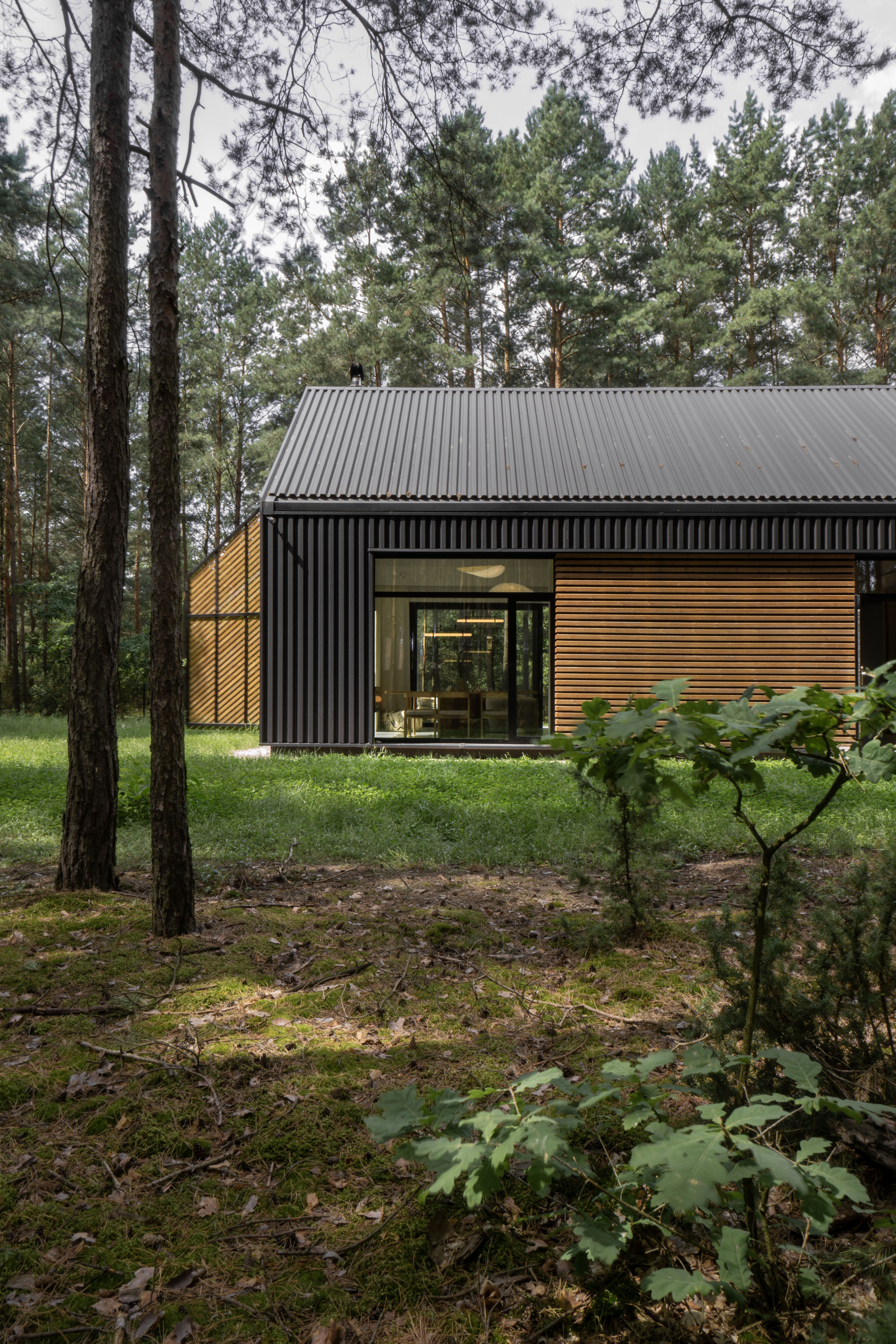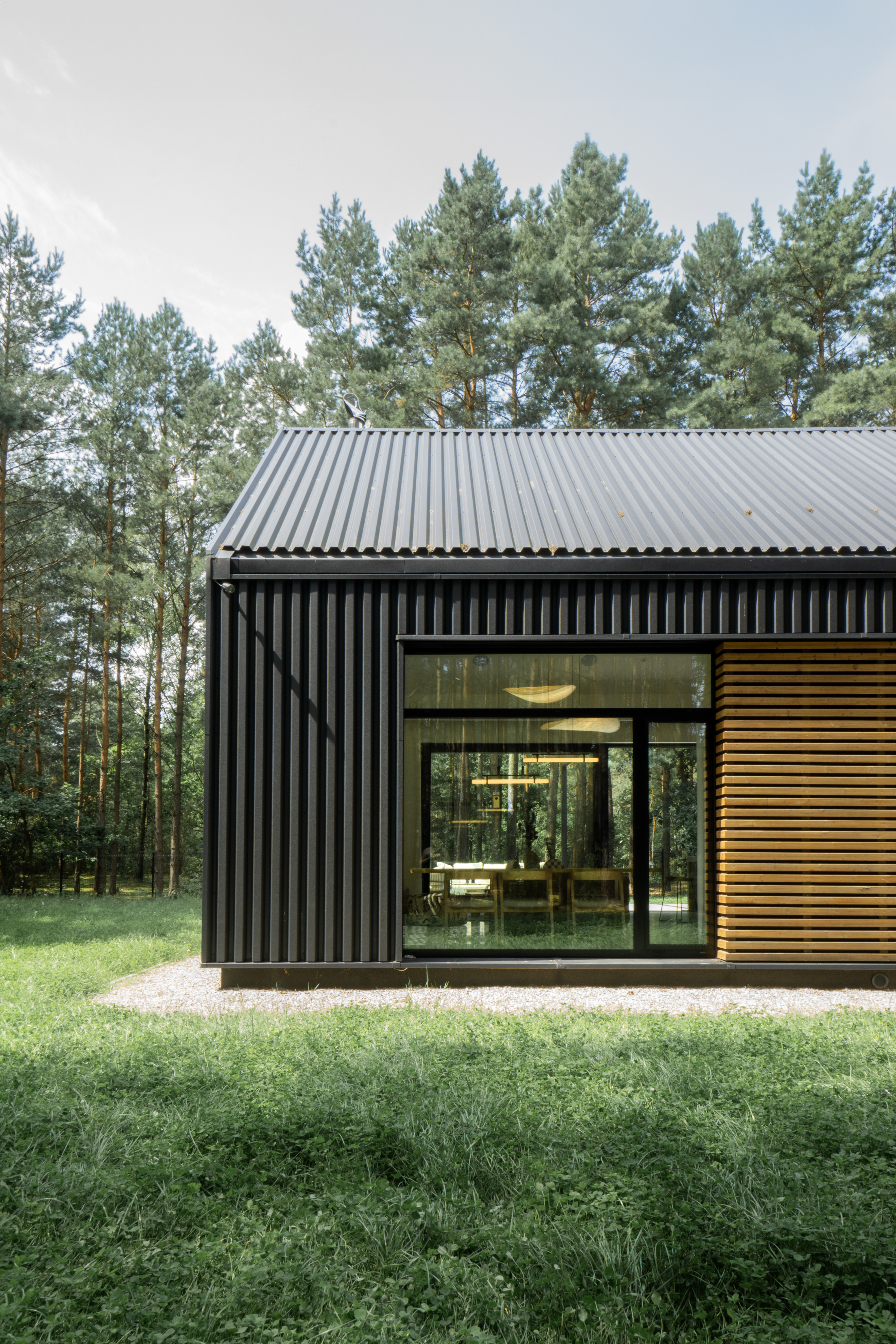 Elewacja i dach zostały wykończone z blachy trapezowej w czarnym odcieniu. Jako kontrast dla głębokiego odcienia blachy, wprowadzono akcenty w postaci termicznego drewna sosnowego na elewacji.