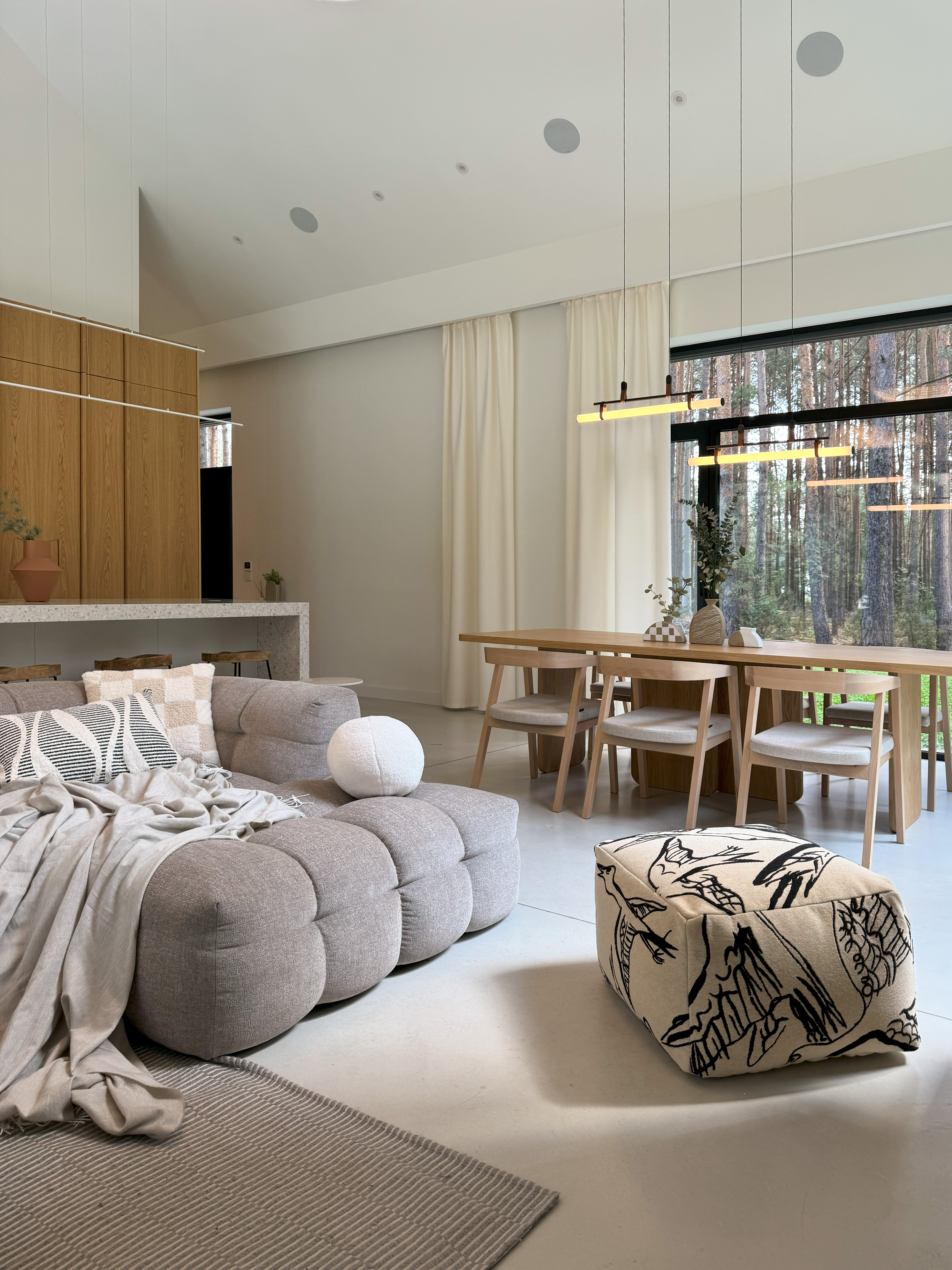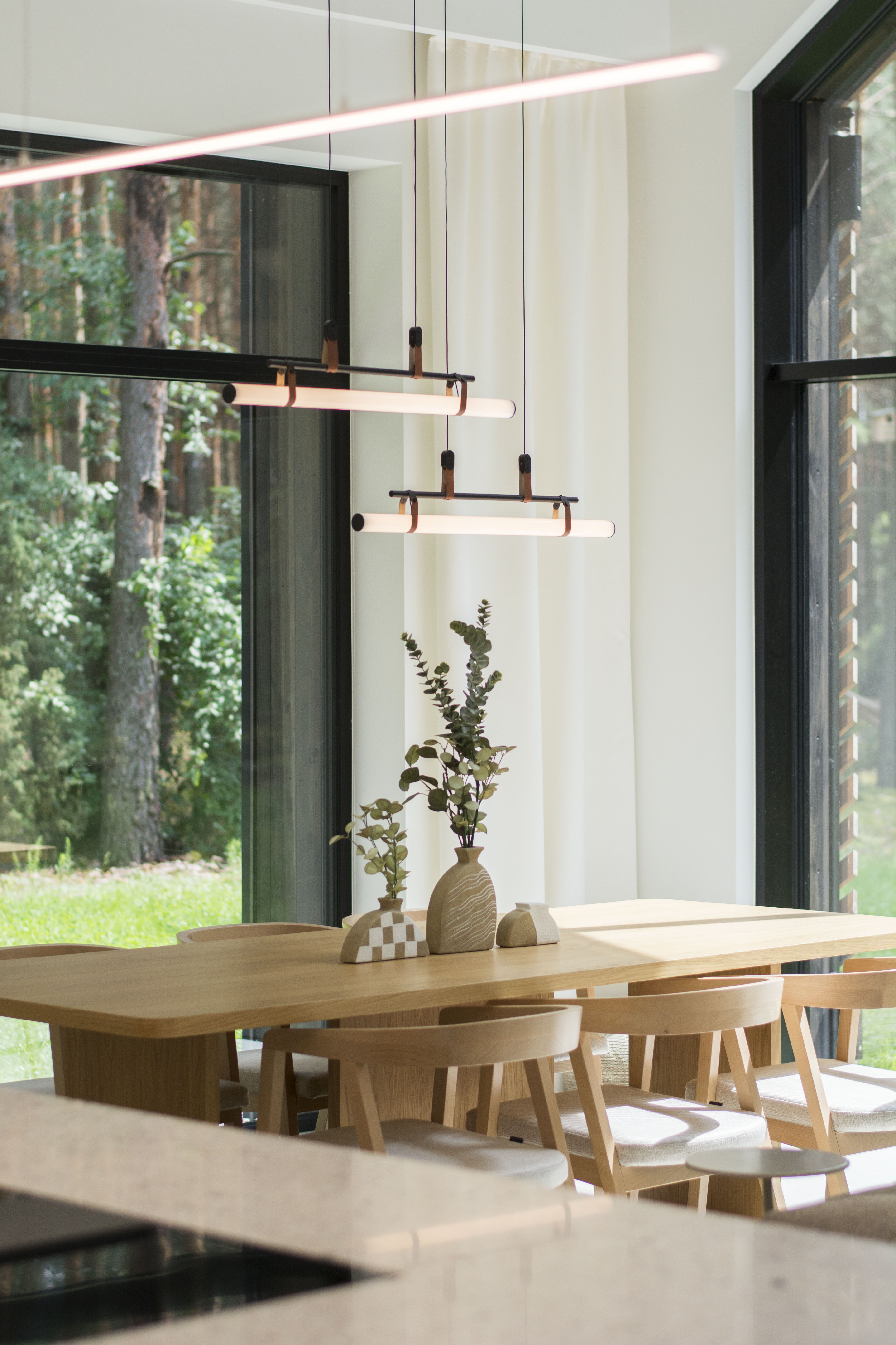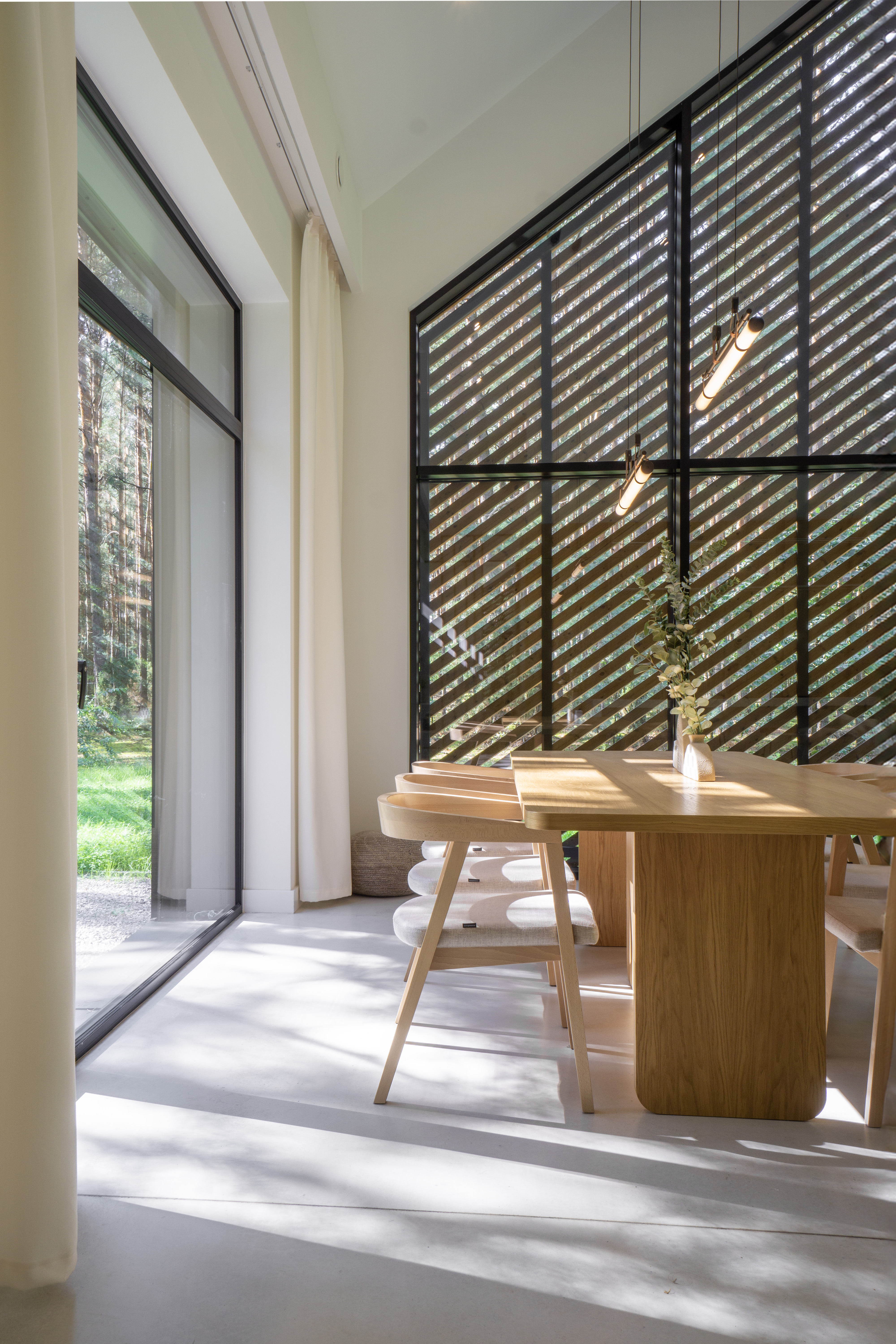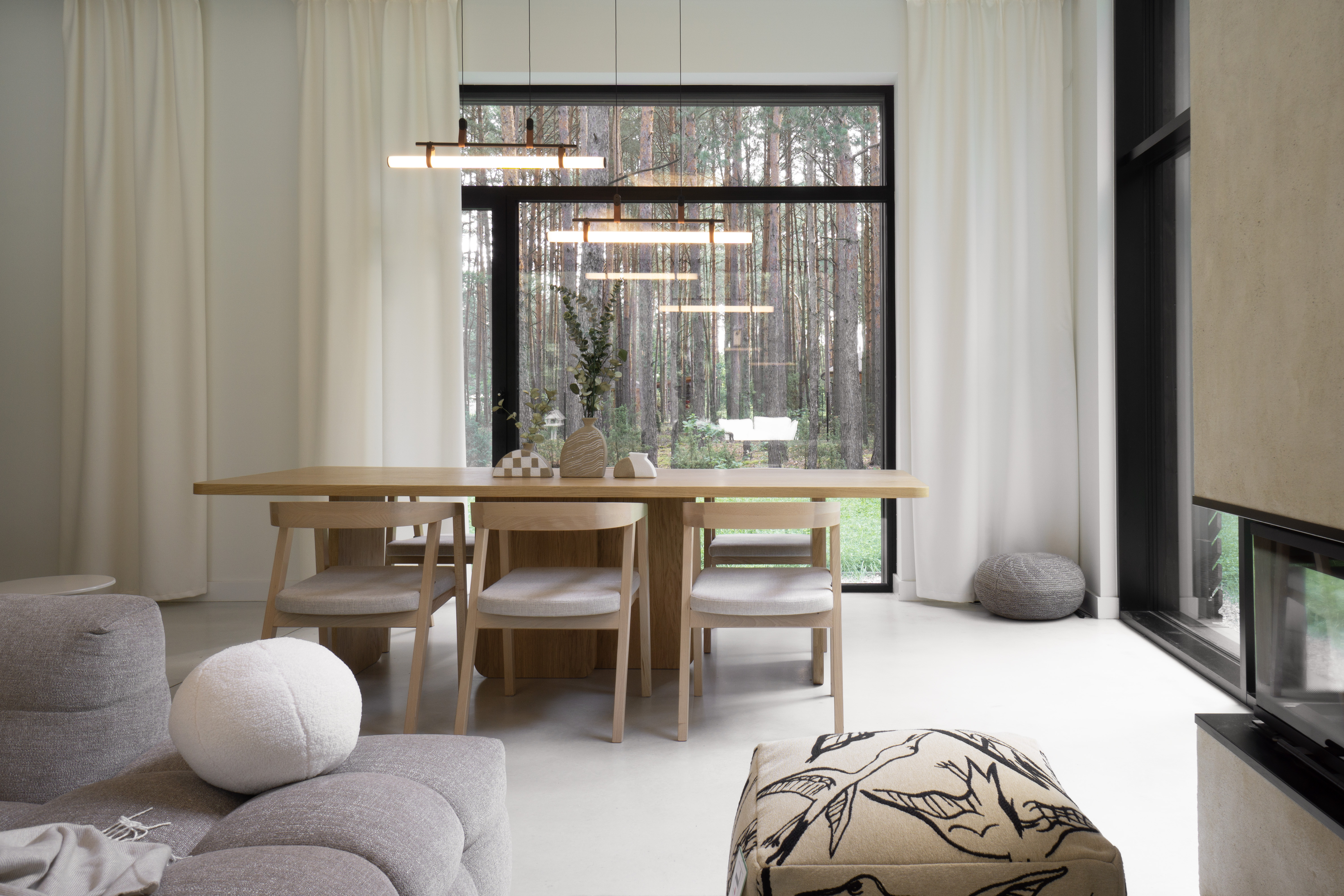 W całym domu, by podkreślić minimalistyczne, obszerne płaszczyzny drewna, betonu, tynku, zaproponowaliśmy niesztampowe w formie oraz poniekąd zaskakujące meble i oświetlenie, które równoważą kąty proste oraz linie. Pojawiają się np. zakrąglone nogi i blat stołu w jadalni, który został przez nas zaprojektowany od zera, jak i obłe, nieregularne formy, np. stolików w salonie czy lamp.