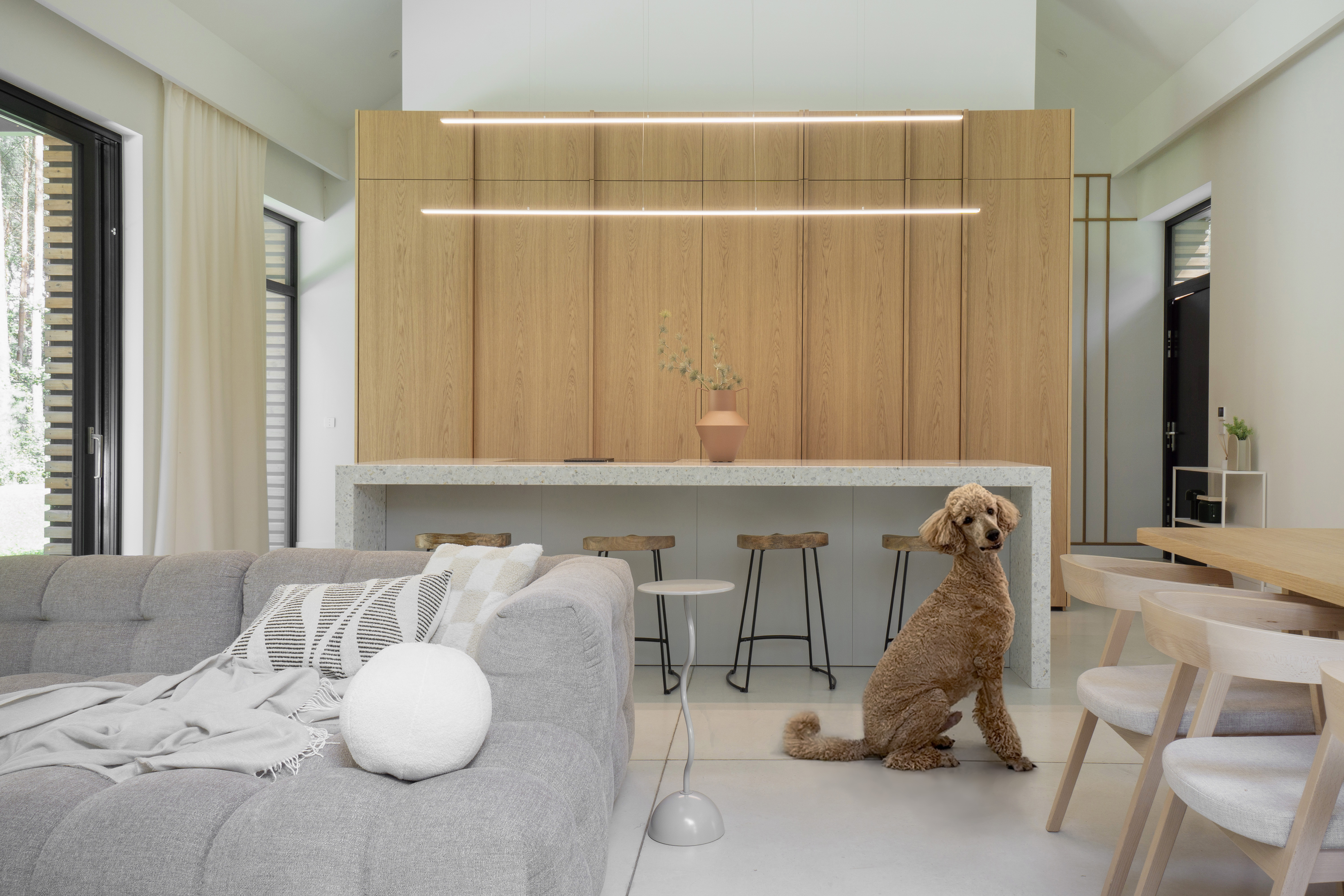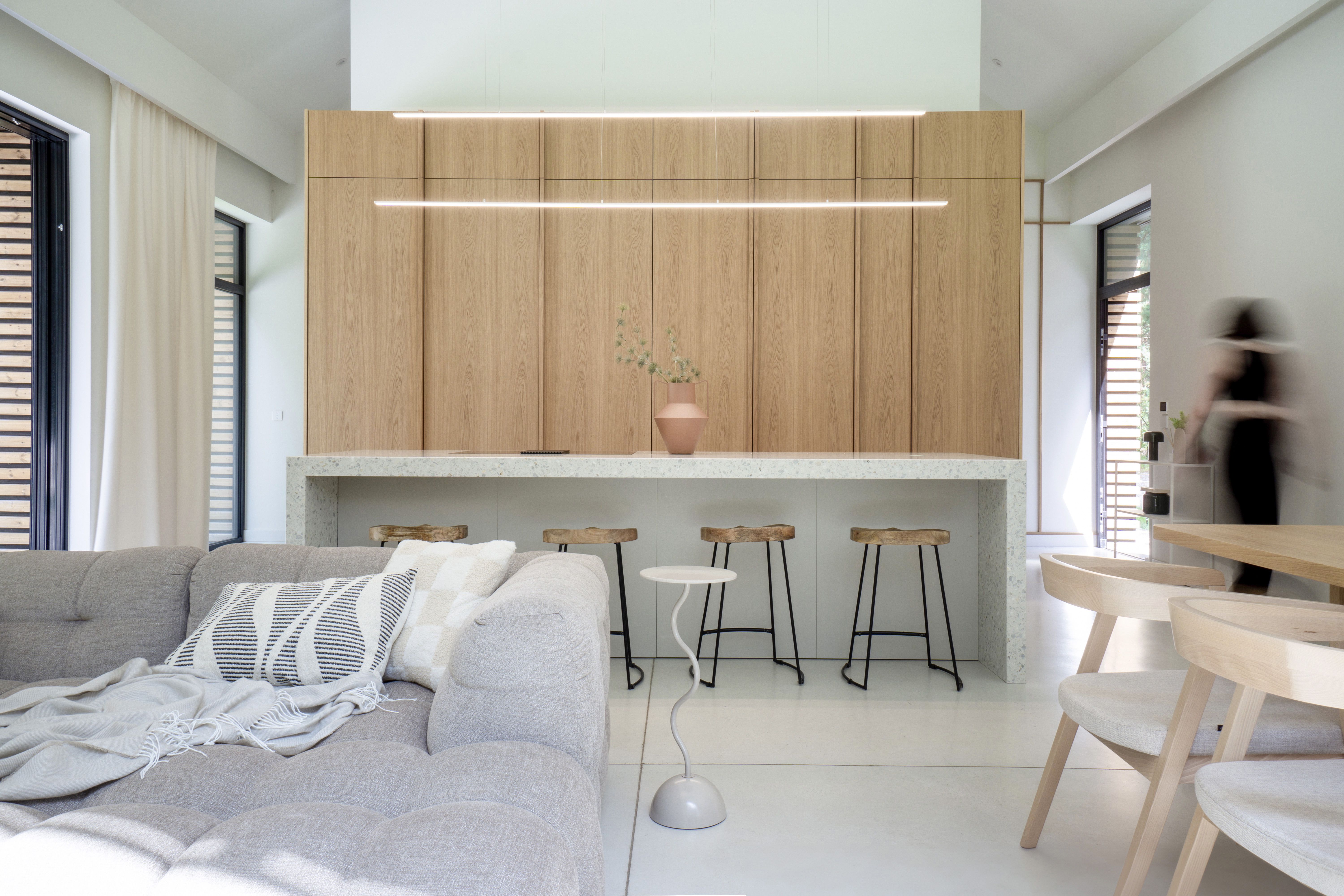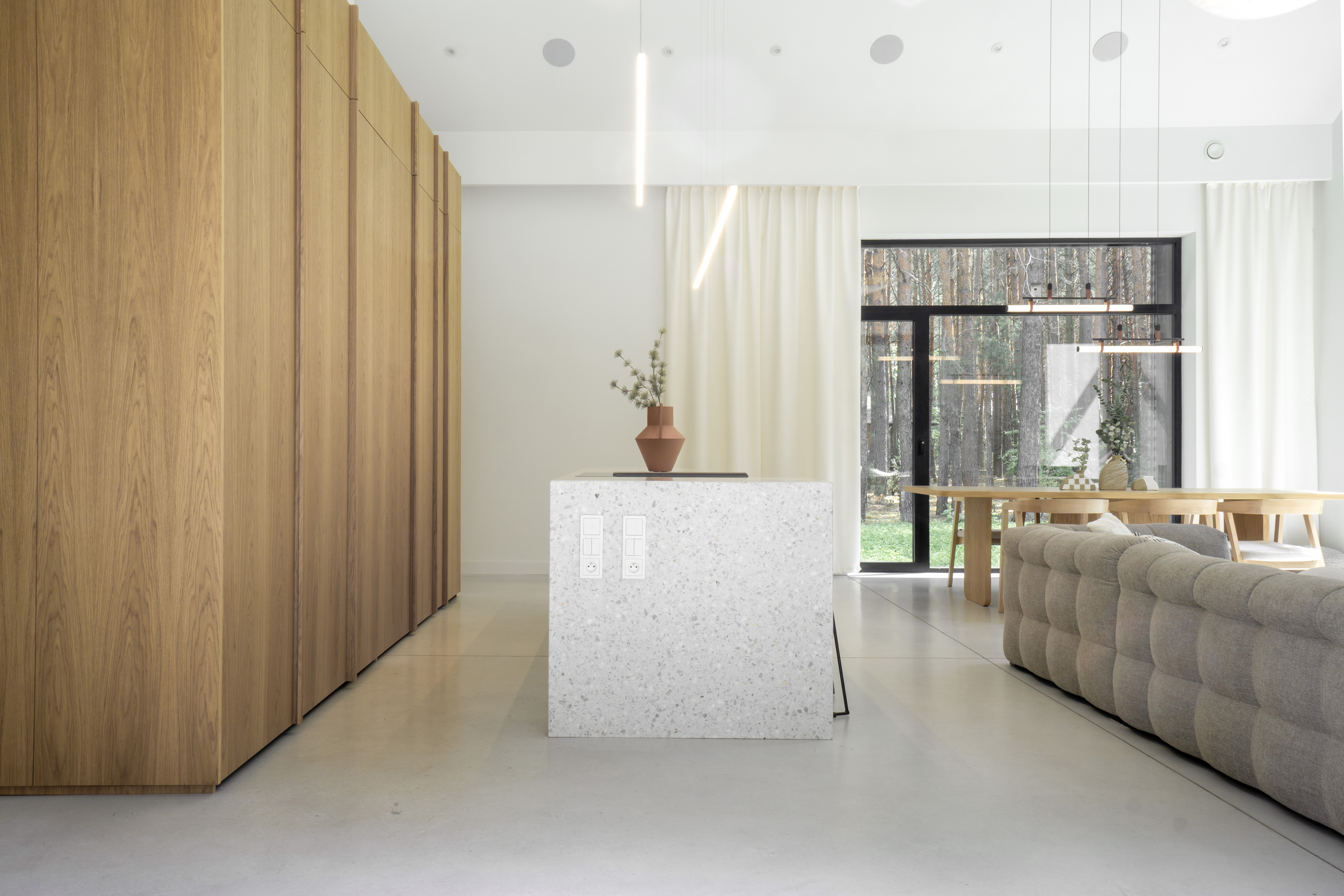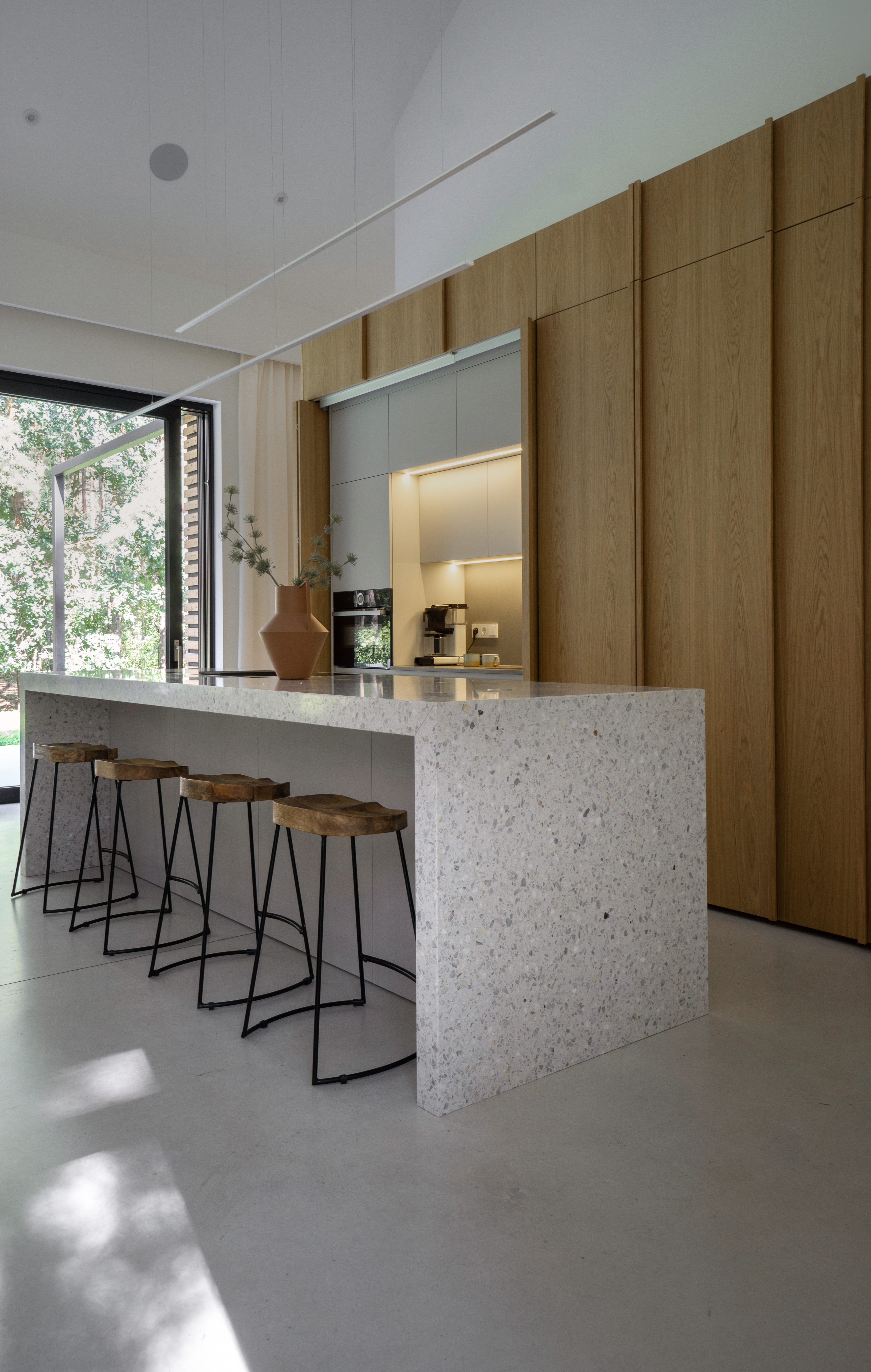 Obszerna wyspa, będąca centralnym punktem części dziennej, została wykonana z terazzo, który z zasady jest materiałem ekologicznym, zawierającym cząstki materiałów pochodzących z recyklingu.