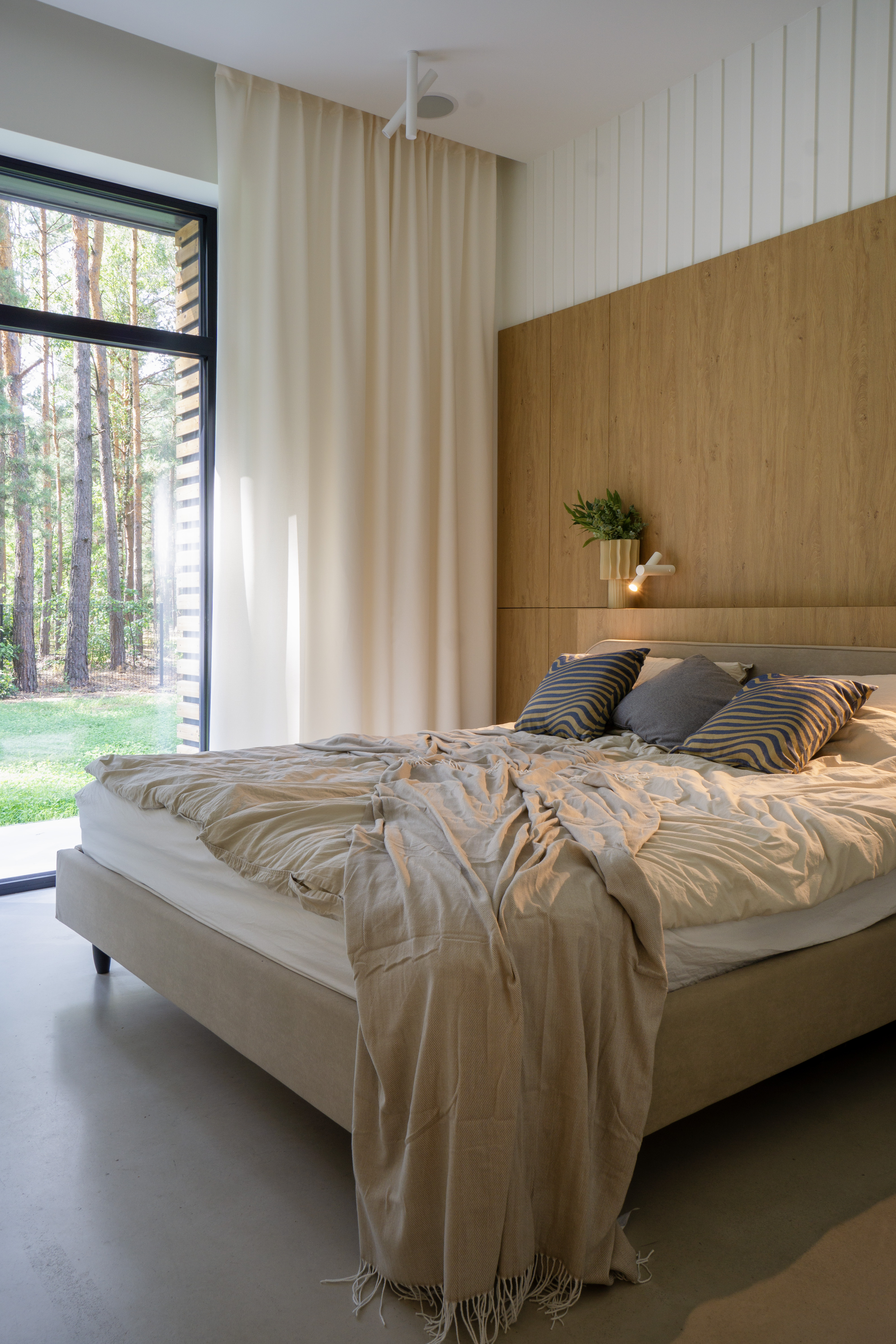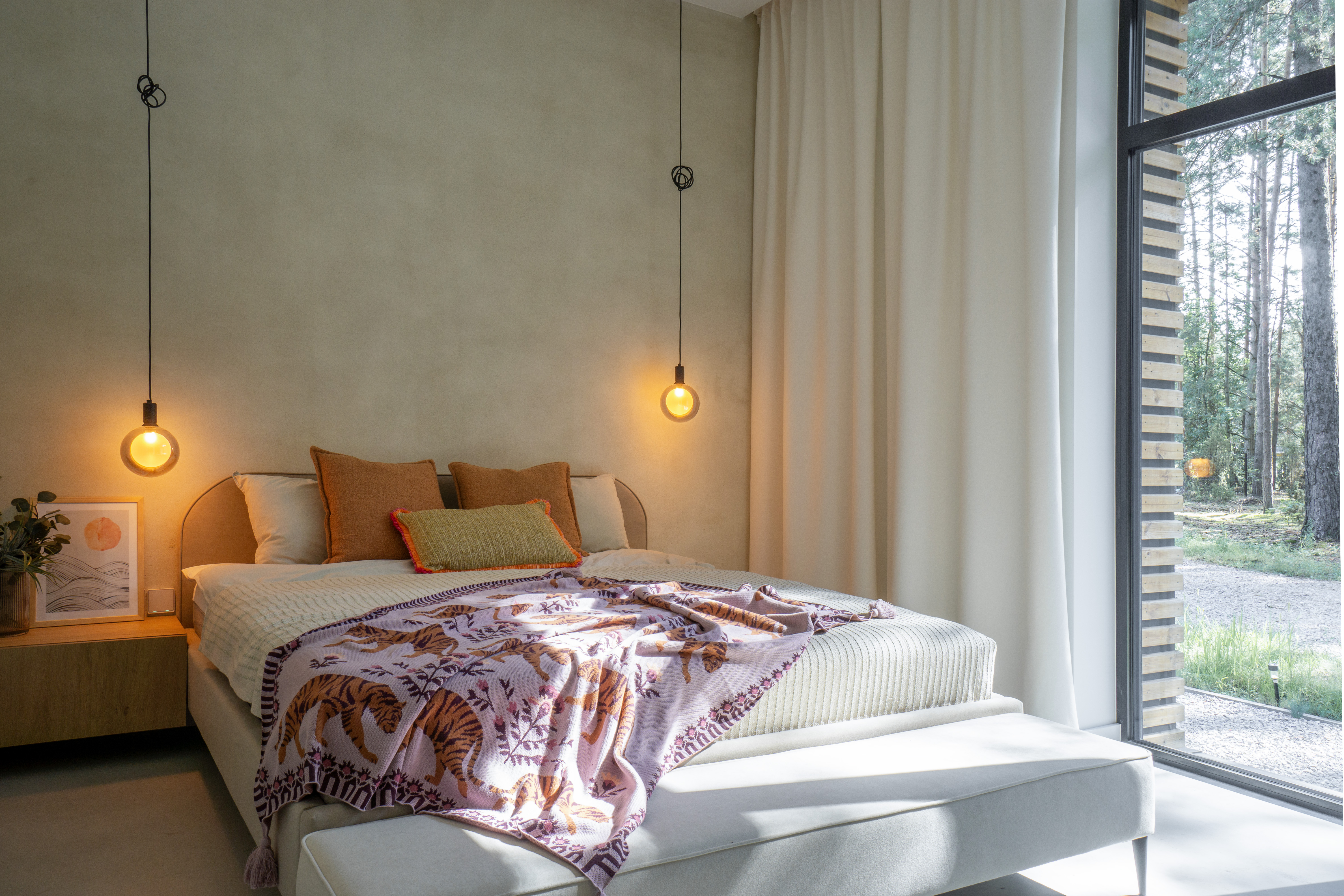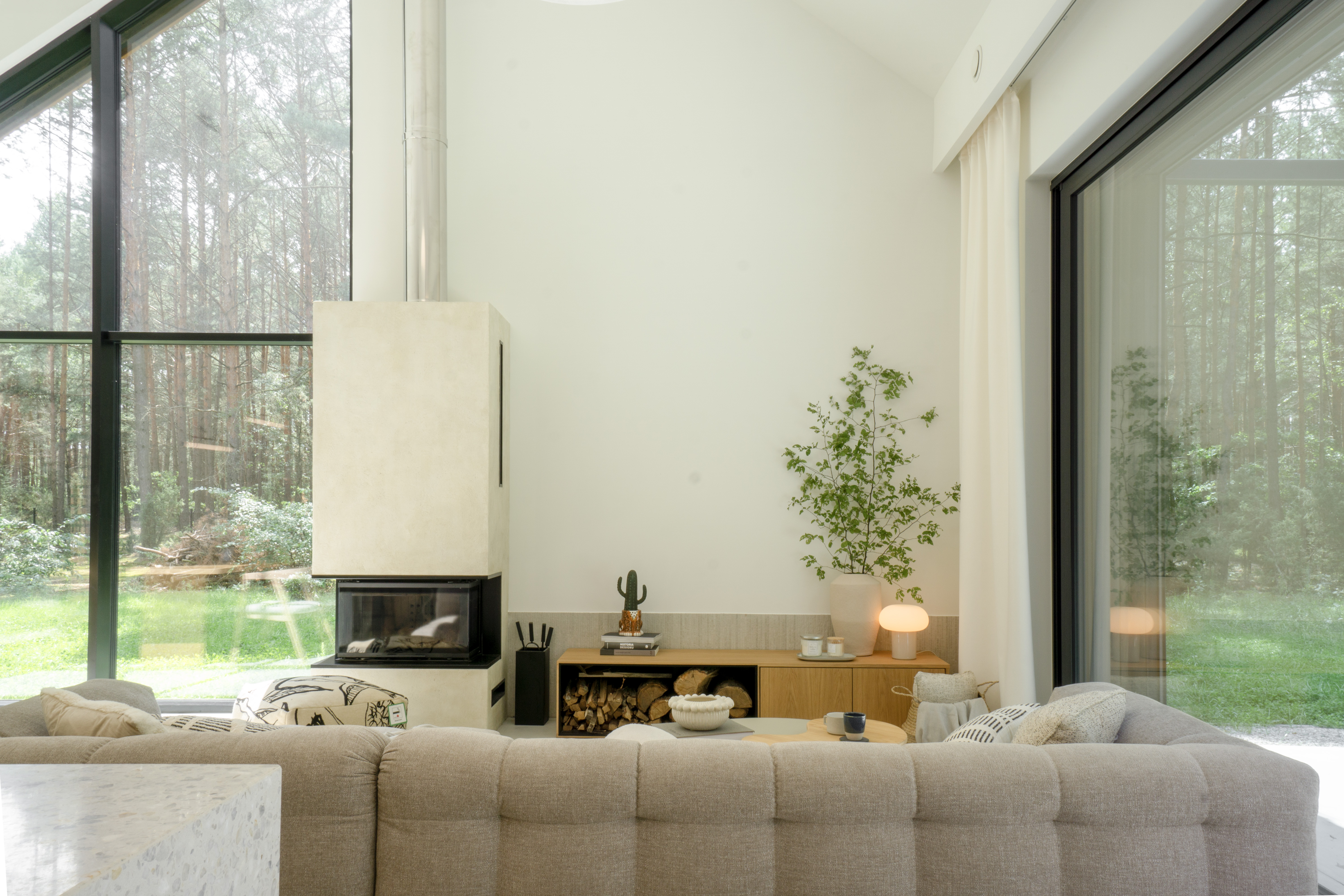 Ściany w jednej z sypialni oraz kominek pokryte zostały nieidealnym, glinianym tynkiem, będącym kolejnym odniesieniem do stylistyki japandi.