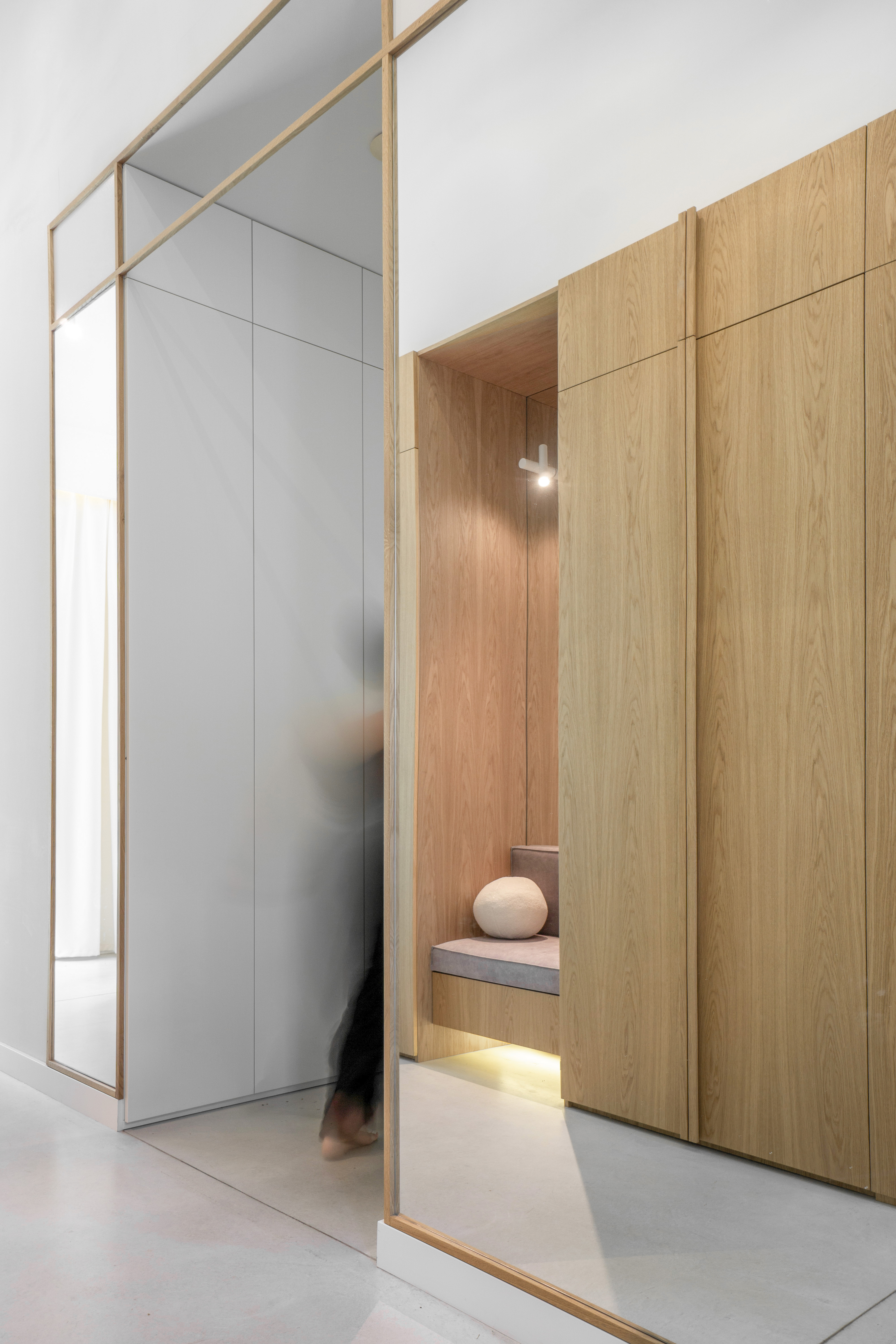Zabudowy meblowe zostały wykonane z wybarwianego, dębowego forniru. Rytmiczne, pionowe pochwyty zostały ręcznie wykonane z litego drewna. Drewno jest kluczowym elementem w tej przestrzeni, pojawia się zarówno w formie zabudów, jak i mebli wolnostojących, czy rytmicznych podziałów na ścianach w formie drewnianych listewek.