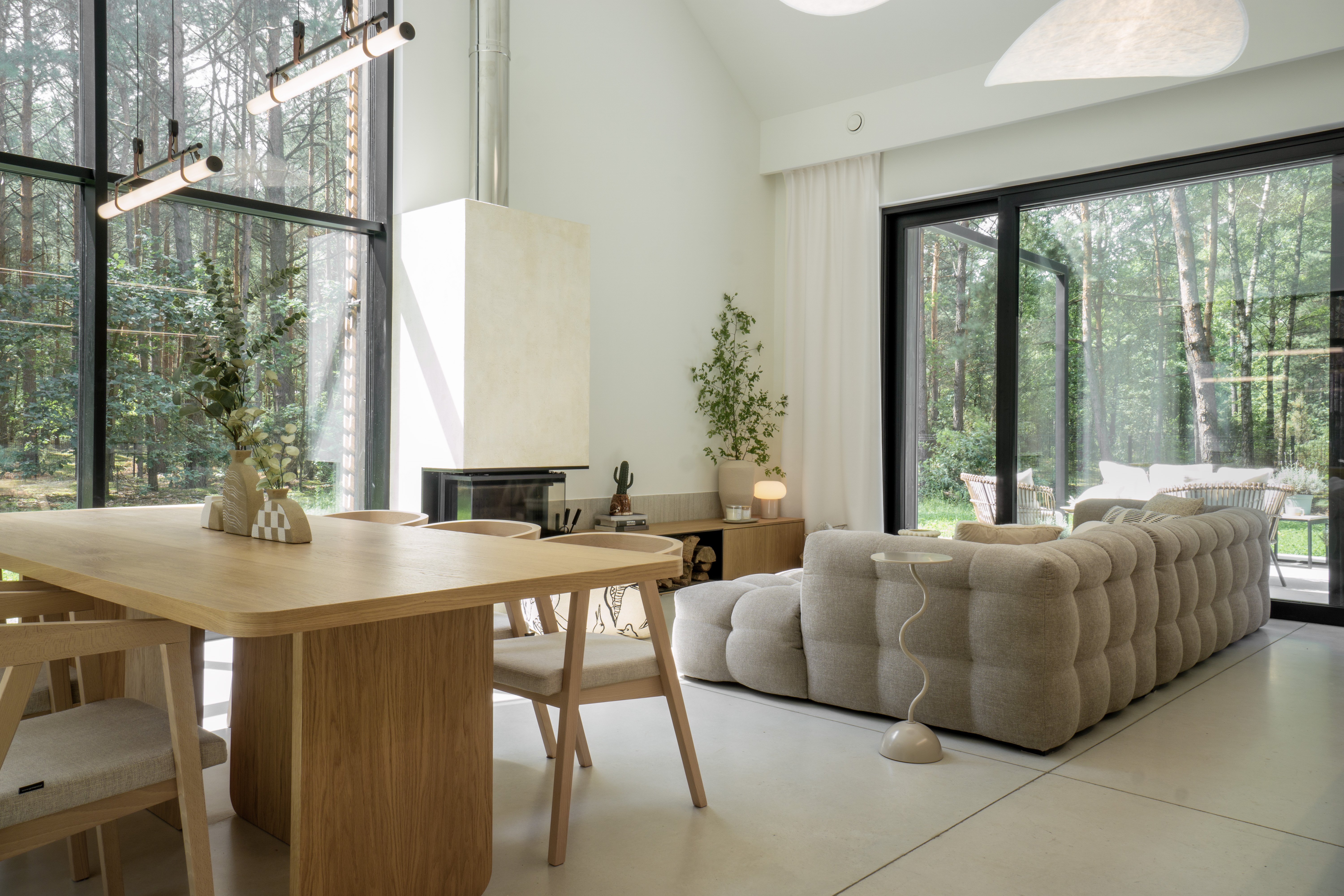 Ponadto kluczową rolę dla Inwestorów grało światło. Przestrzenie miały być maksymalnie doświetlone światłem dziennym, co wpływa na poczucie przestronności i komfortu. Dlatego już na etapie projektowania zadbano o to, by duże okna i przeszklone ściany pozwalały na swobodny przepływ naturalnego światła do wnętrza domu. Rozmieszczenie otworów okiennych zostało starannie przemyślane, tak aby światło dzienne mogło penetrować wszystkie pomieszczenia, tworząc jasne, przyjazne przestrzenie, które zmieniają się wraz z porami dnia. Kluczowe było również uwzględnienie orientacji domu względem stron świata, aby maksymalnie wykorzystać naturalne światło w różnych porach roku.