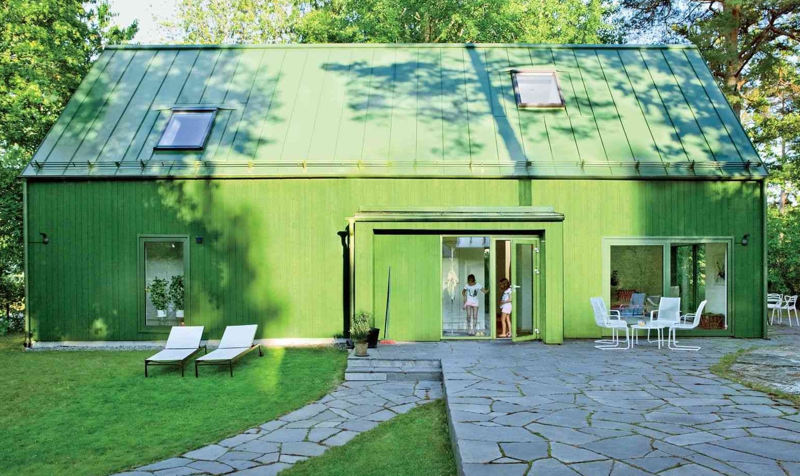 Projektując rodzinny dom na przedmieściach Sztokholmu, architekt Per Franson postanowił cofnąć się do prostych skojarzeń: jak dziecko narysowałoby dom? Efektem tej koncepcji jest zaskakująco minimalistyczny budynek o zwartej formie, przypominający symboliczne domki znane z gry Monopoly. Zielona, geometryczna bryła to efekt zastosowania prefabrykowanych elementów, które nie tylko przyspieszają budowę, ale także wpisują się w trend zrównoważonego budownictwa. Prosta forma skrywa przemyślany koncept – zarówno estetyczny, jak i funkcjonalny.