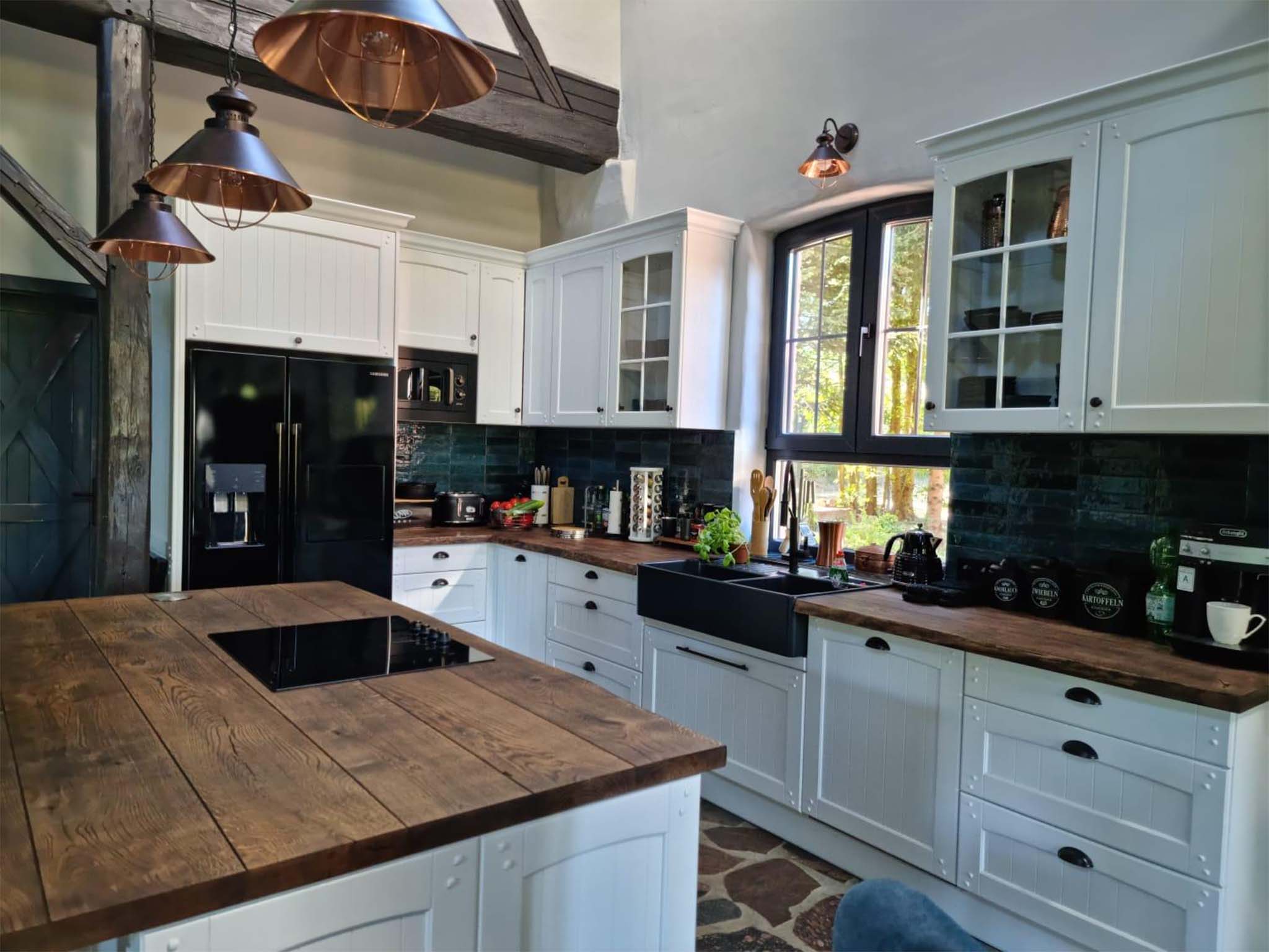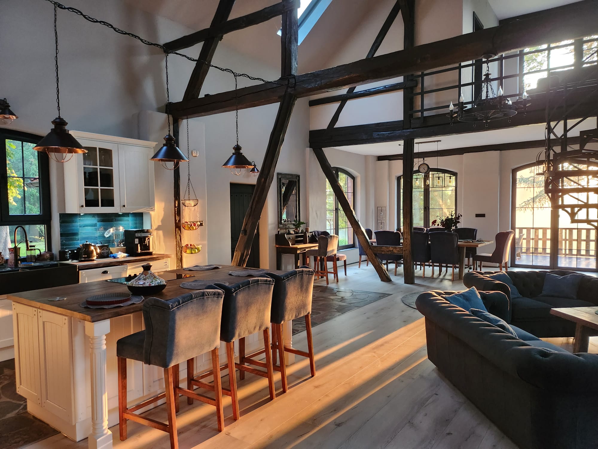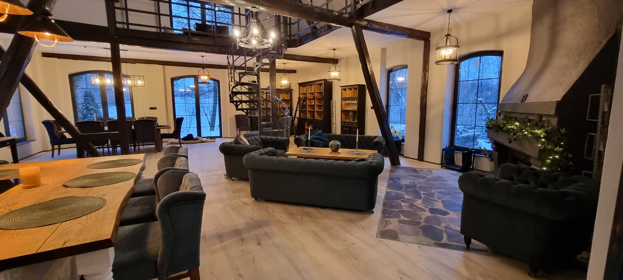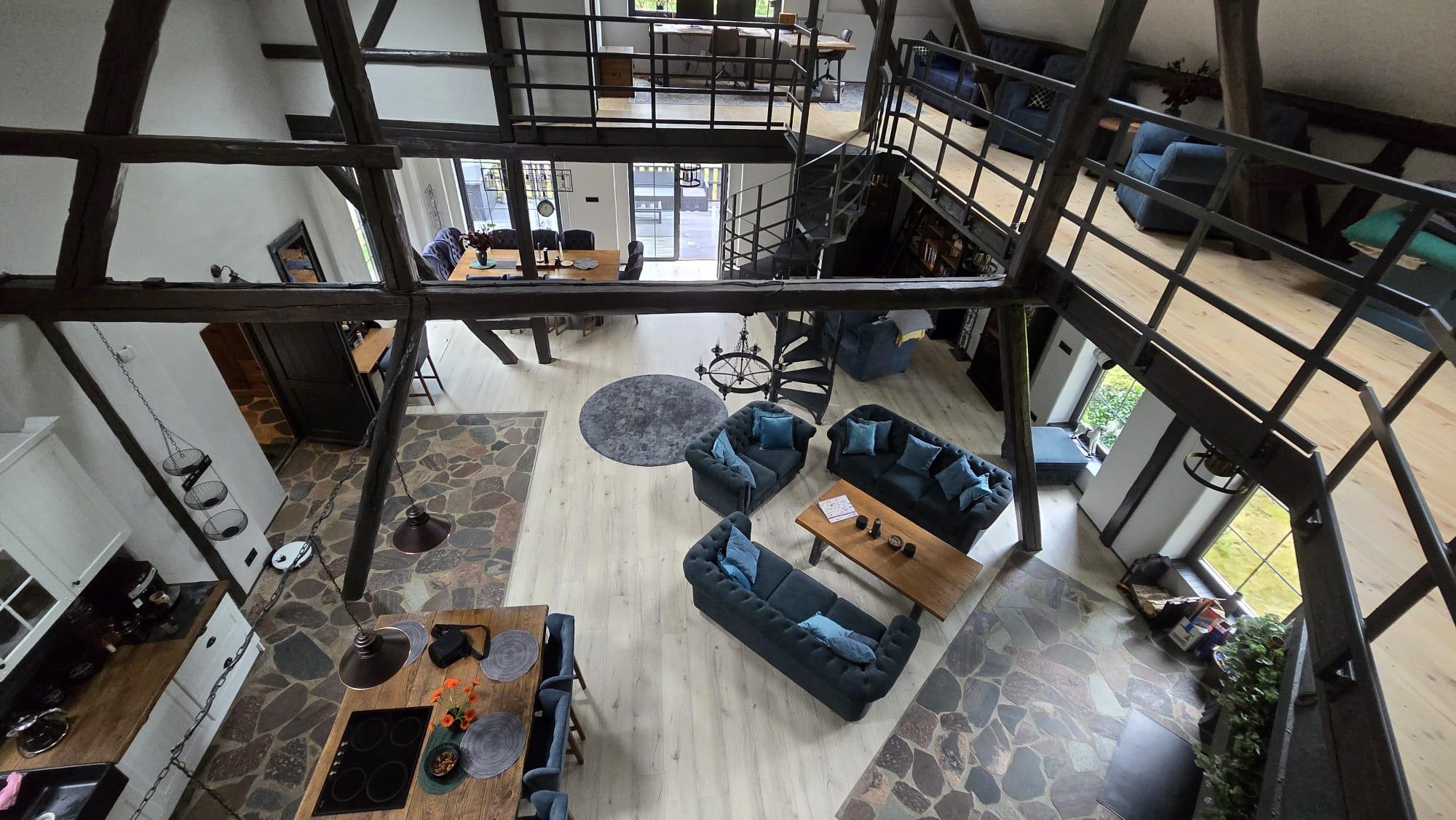 Duże przeszklenia otwierają wnętrze na jezioro i zimowy krajobraz. Światło wchodzi powoli, zmienia się w ciągu dnia, a wieczorem ustępuje miejsca ciepłu kominka. Stodoła nad jeziorem staje się wtedy schronieniem – miejscem rozmów, ciszy i chwil bez planu. Wnętrze nowoczesnego domku nad jeziorem nie przytłacza. Naturalne materiały, stonowane kolory i przestrzeń zaprojektowana tak, by zwalniać, a nie przyspieszać. Tu nic nie rozprasza – wszystko sprzyja odpoczynkowi.