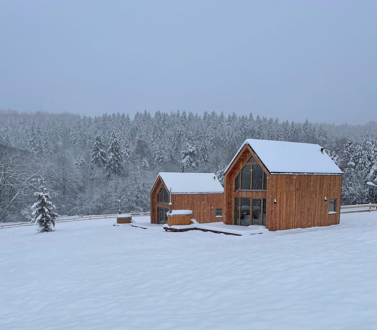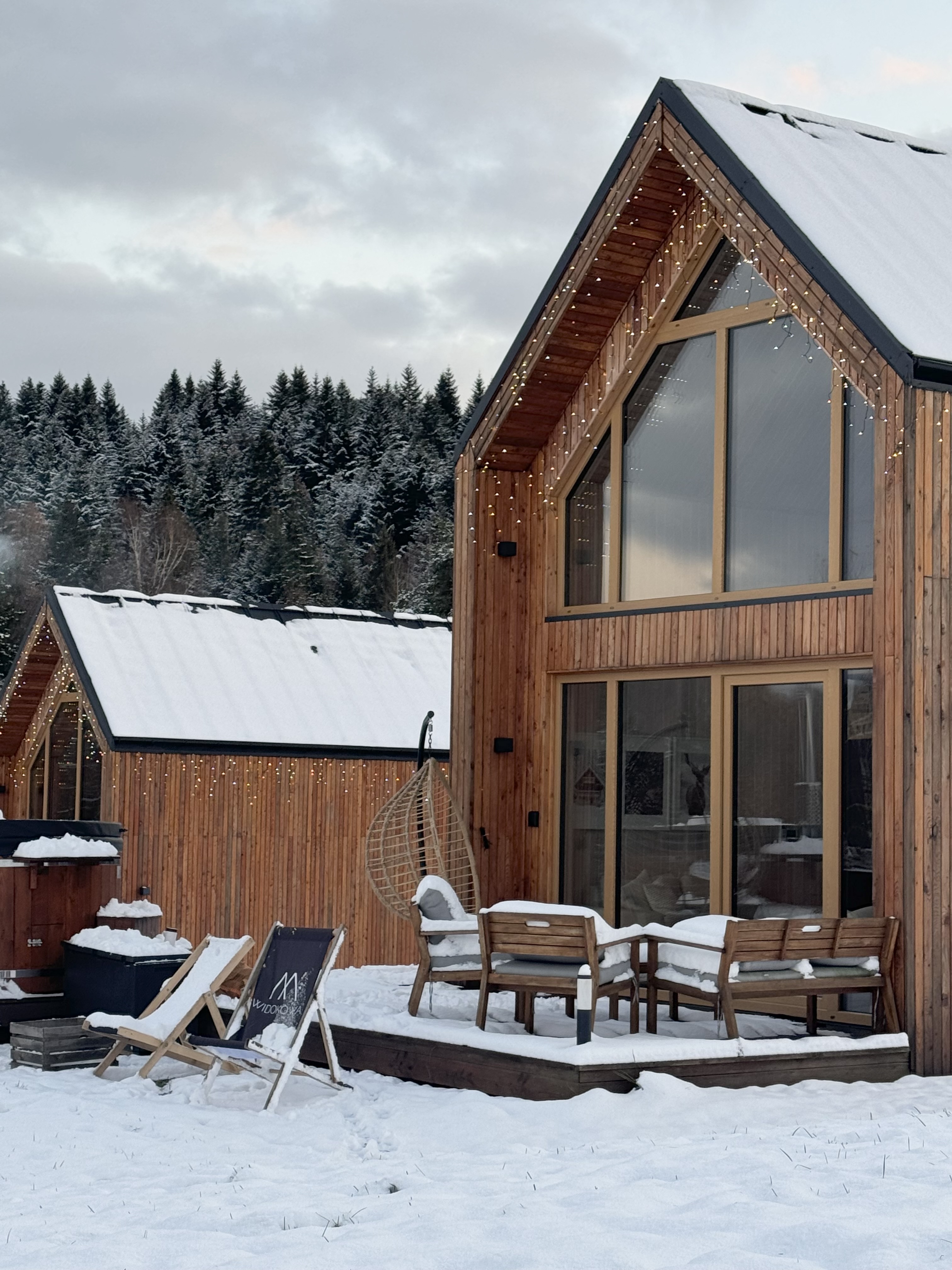 Domki Widokowa to nowoczesna interpretacja górskiej tradycji. Proste, drewniane bryły harmonijnie wpasowują się w otaczający krajobraz, tworząc azyl, który zachwyca zarówno miłośników minimalistycznego designu, jak i tych, którzy cenią sobie ciepło i przytulność. Duże przeszklenia pozwalają cieszyć się panoramicznymi widokami na ośnieżone wzgórza, tworząc wrażenie, że natura jest na wyciągnięcie ręki.