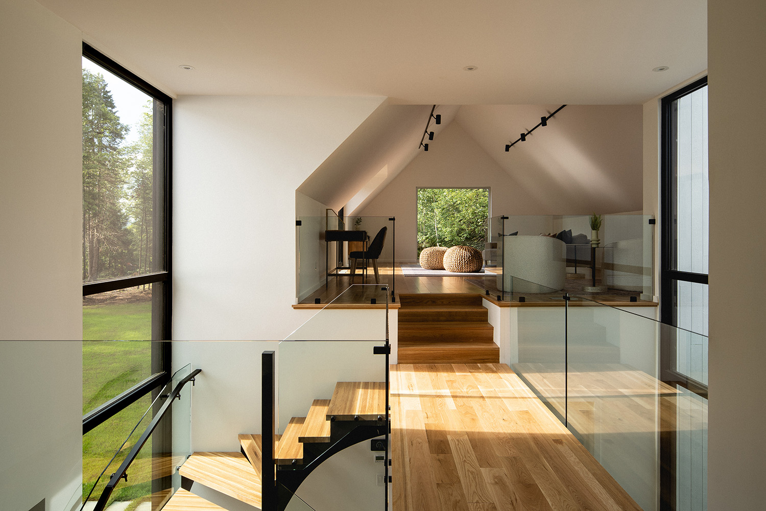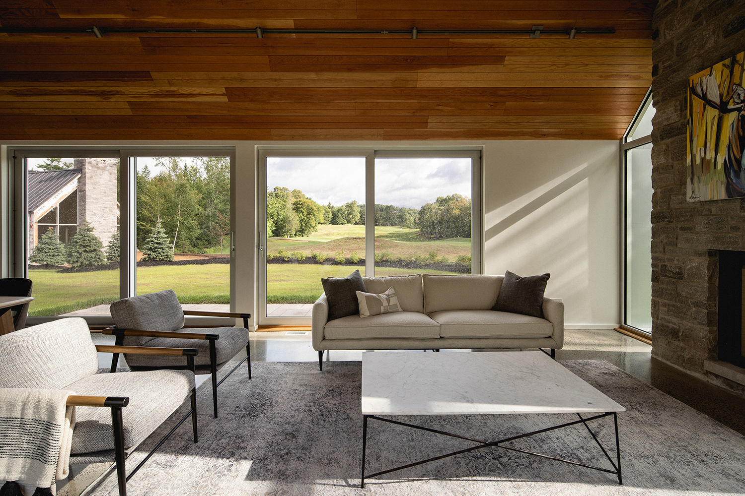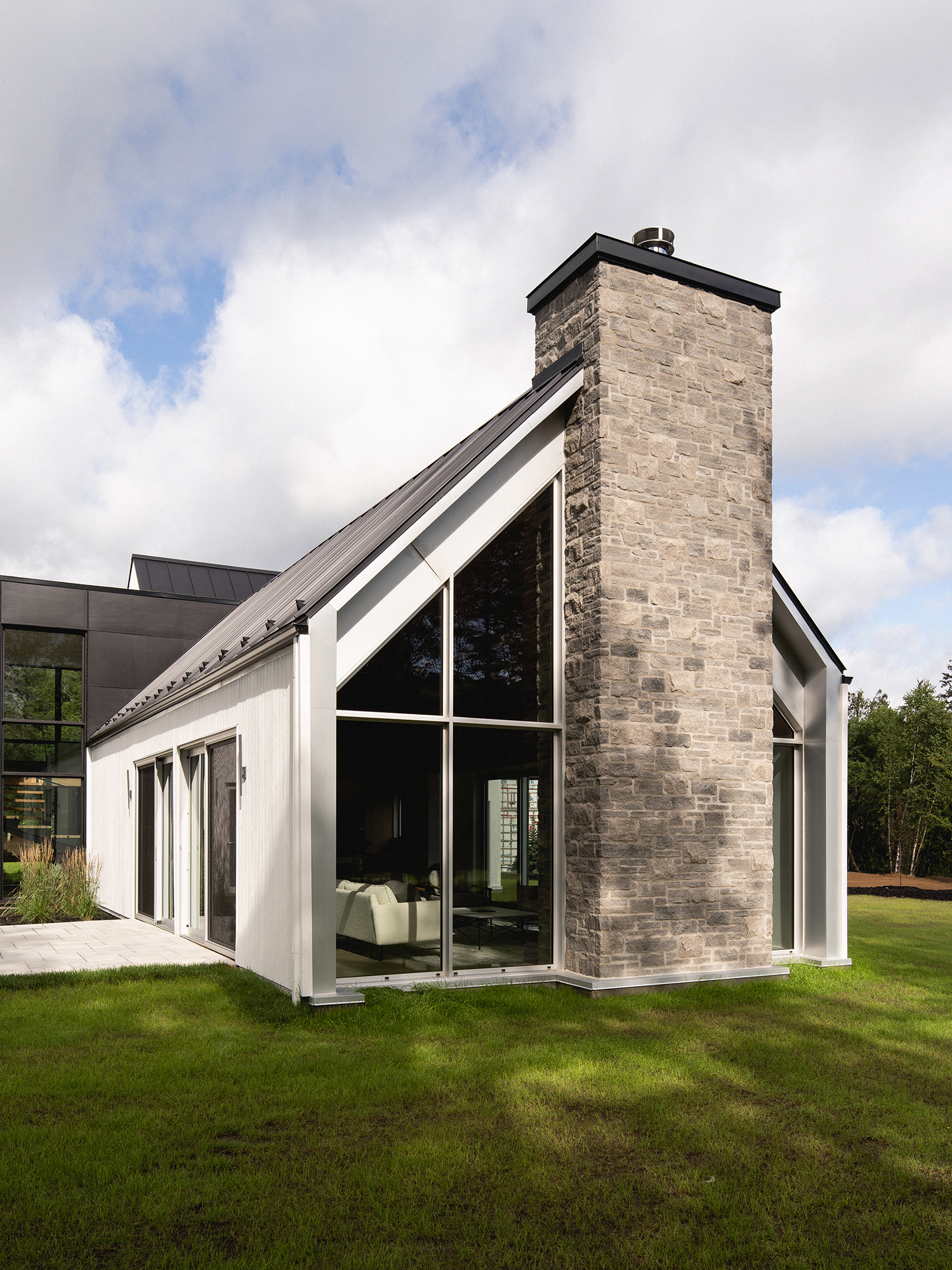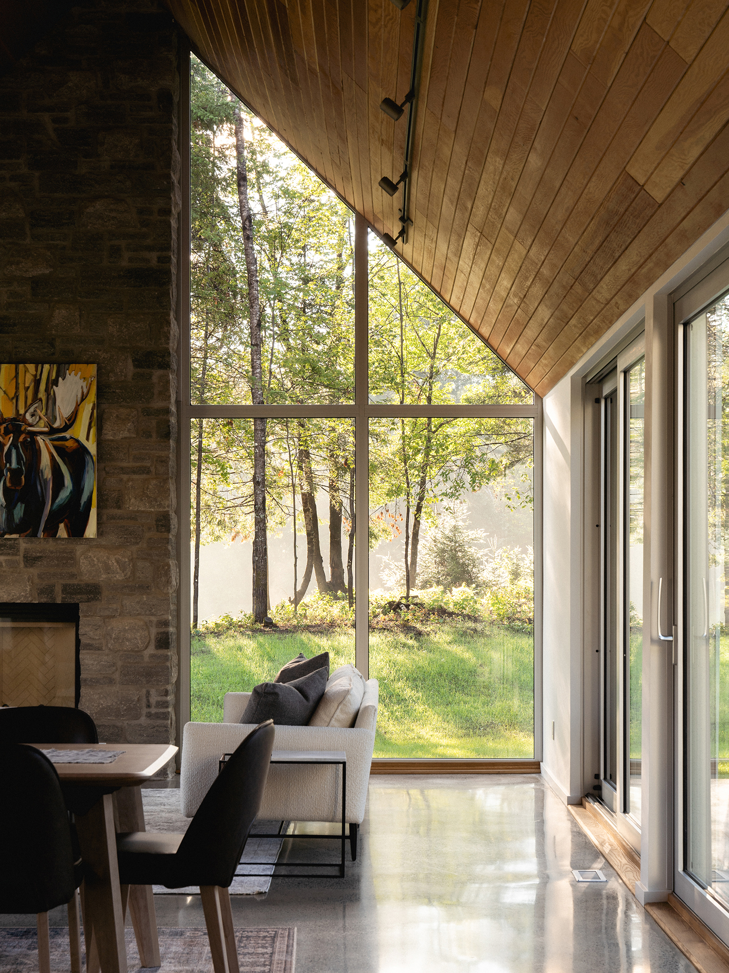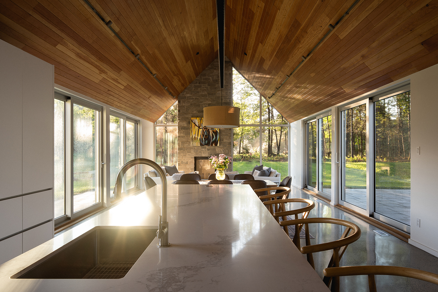 Bryła Résidence Rabaska przypomina literę T – dwie dwuspadowe formy przecinają się, tworząc wyraźny podział funkcjonalny. Główne skrzydło, parterowe, pełni funkcję dzienną – znajduje się tu nowoczesna kuchnia, przestronna jadalnia oraz otwarty salon z kominkiem. Dwa duże, 5-metrowe przeszklenia wschodnio-zachodnie otwierają dom na widok pola golfowego oraz na taras i ogród, zapewniając naturalne światło i spektakularne widoki. Kamienny kominek przy południowym szczycie oraz panoramiczne okna po obu stronach kadrują widok na ocalały las sosnowy.