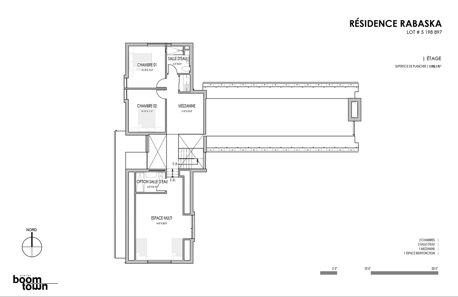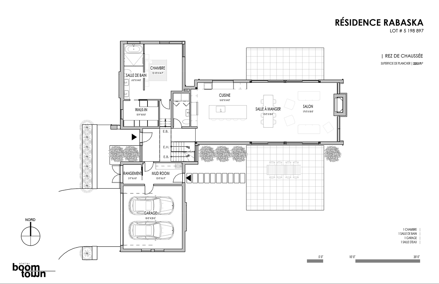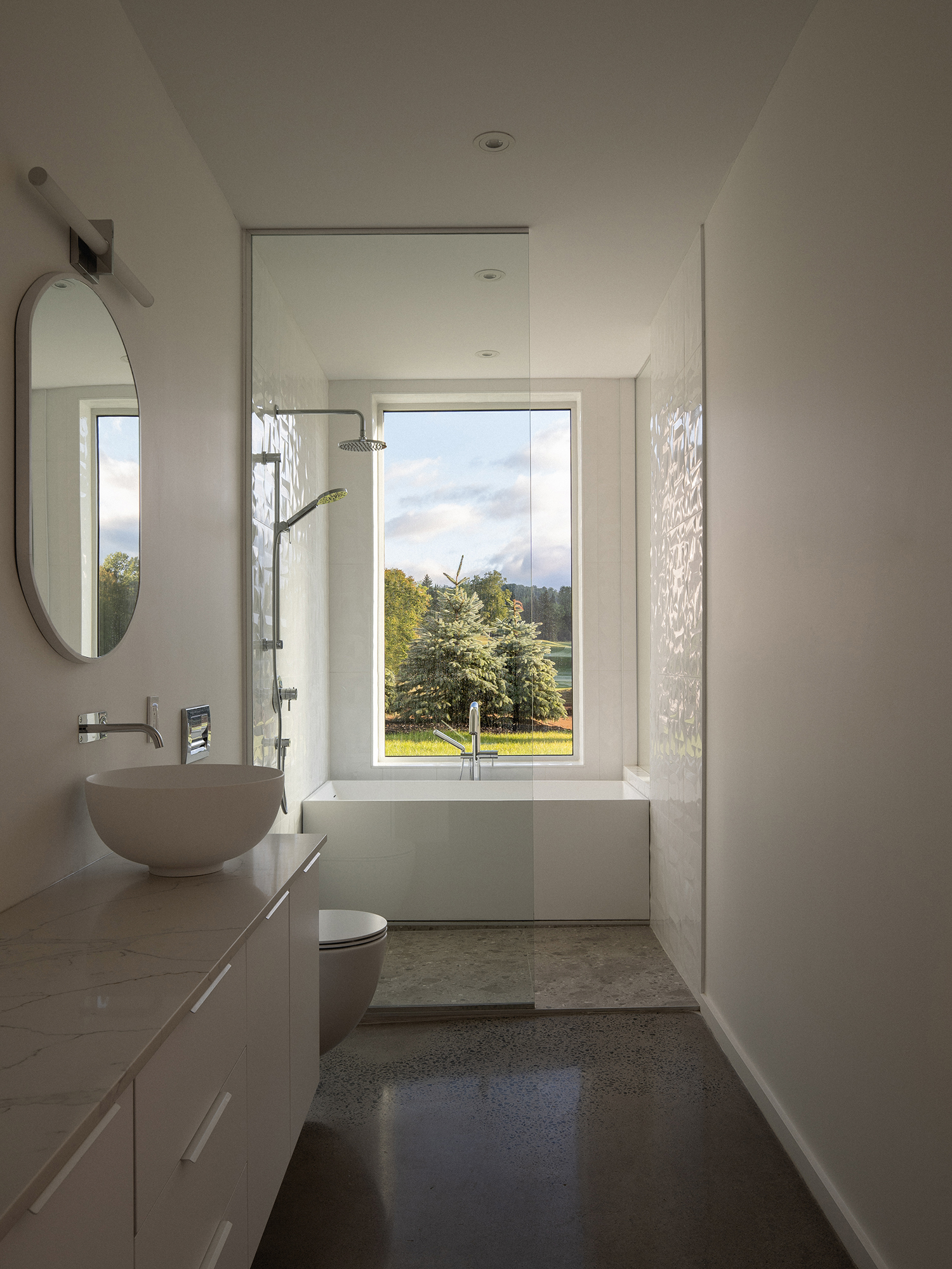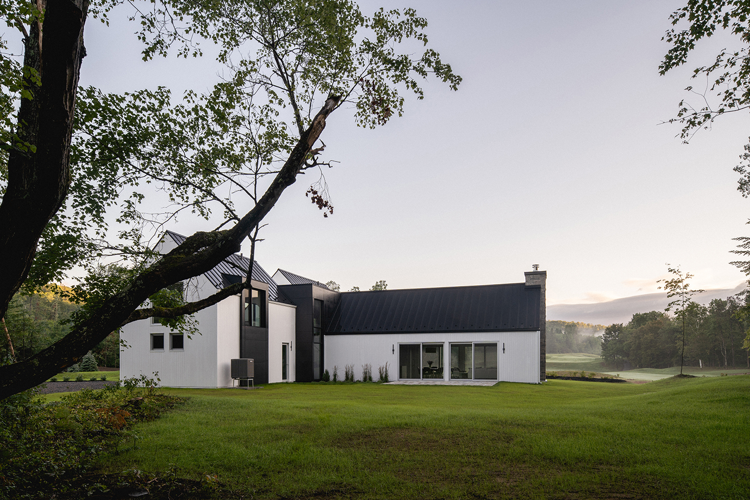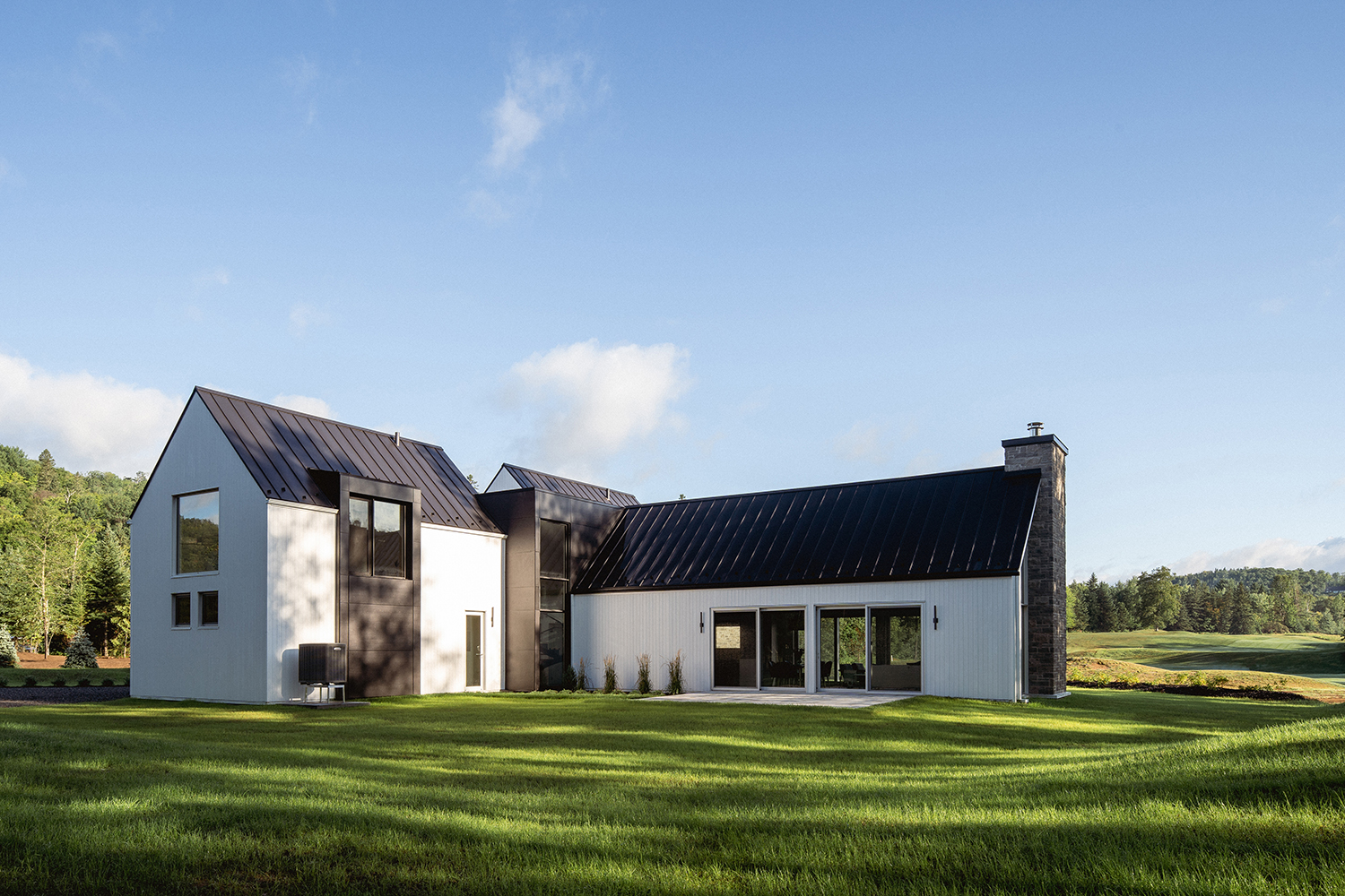 Bryła Résidence Rabaska przypomina literę T – dwie dwuspadowe formy przecinają się, tworząc wyraźny podział funkcjonalny. Główne skrzydło, parterowe, pełni funkcję dzienną – znajduje się tu nowoczesna kuchnia, przestronna jadalnia oraz otwarty salon z kominkiem. Dwa duże, 5-metrowe przeszklenia wschodnio-zachodnie otwierają dom na widok pola golfowego oraz na taras i ogród, zapewniając naturalne światło i spektakularne widoki. Kamienny kominek przy południowym szczycie oraz panoramiczne okna po obu stronach kadrują widok na ocalały las sosnowy.