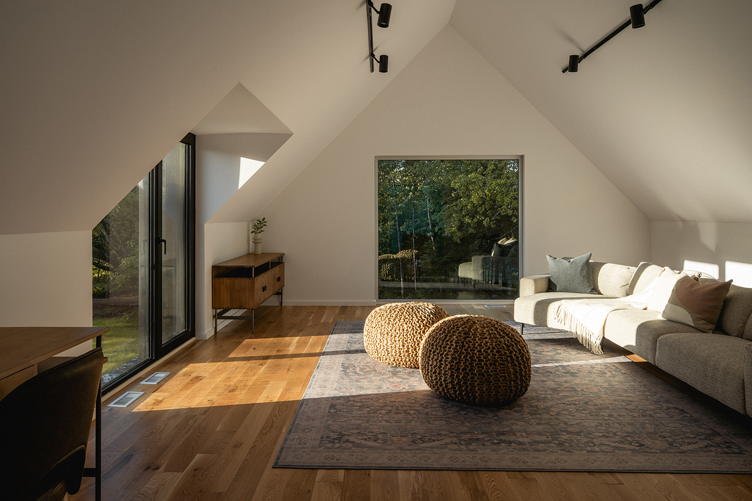 Drugie, dwukondygnacyjne skrzydło mieści prywatną strefę nocną. Główna sypialnia, z własną łazienką i garderobą, jest delikatnie wpuszczona w podłogę dla większej intymności. Dwie sypialnie gościnne umieszczono na piętrze, a poniżej zlokalizowano biuro otwarte na wejściowy hol oraz dodatkową łazienkę. W zachodniej części znajduje się garaż dwustanowiskowy, a nad nim wielofunkcyjny pokój rodzinny, który może służyć jako sala telewizyjna, pokój gier lub strefa relaksu. Wszystkie części domu wieńczą stropy katedralne, podkreślające otwartość i przestrzeń charakterystyczną dla stylu nowoczesnej stodoły. Sufity wykończono naturalną boazerią na parterze oraz gładkim tynkiem gipsowym na piętrze. Drewniane podłogi dodają ciepła, a płyty betonowe z ogrzewaniem podłogowym zapewniają komfort przez cały rok.