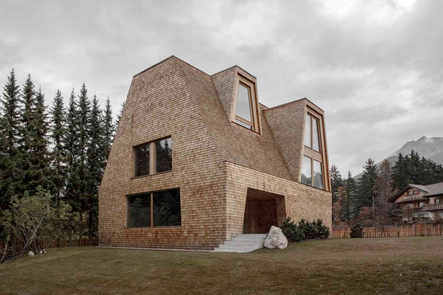 Położony w południowotyrolskim St. Vigil House Aqua Bad Cortina, znany także jako CiAsa, to wyjątkowy projekt architektoniczny inspirowany stylem retroromańskim. Bryła domu, w całości pokryta naturalnym drewnem, wyróżnia się na tle Dolomitów Val Badia swoją monumentalną, a zarazem organiczną formą. Architekci stworzyli konstrukcję, w której dach i fasada stanowią jedność, nadając budynkowi wygląd surowego, kamiennego monolitu. Pomimo nowoczesnej interpretacji, CiAsa zachowuje głęboki szacunek dla lokalnej tradycji budowlanej – to projekt łączący regionalizm, zrównoważoną architekturę i ducha nowoczesnej stodoly, idealnie wpisujący się w alpejski krajobraz.