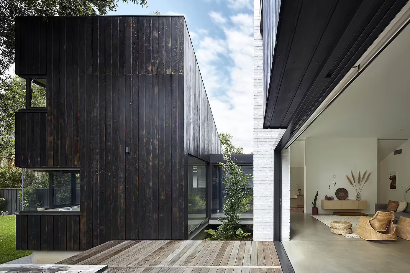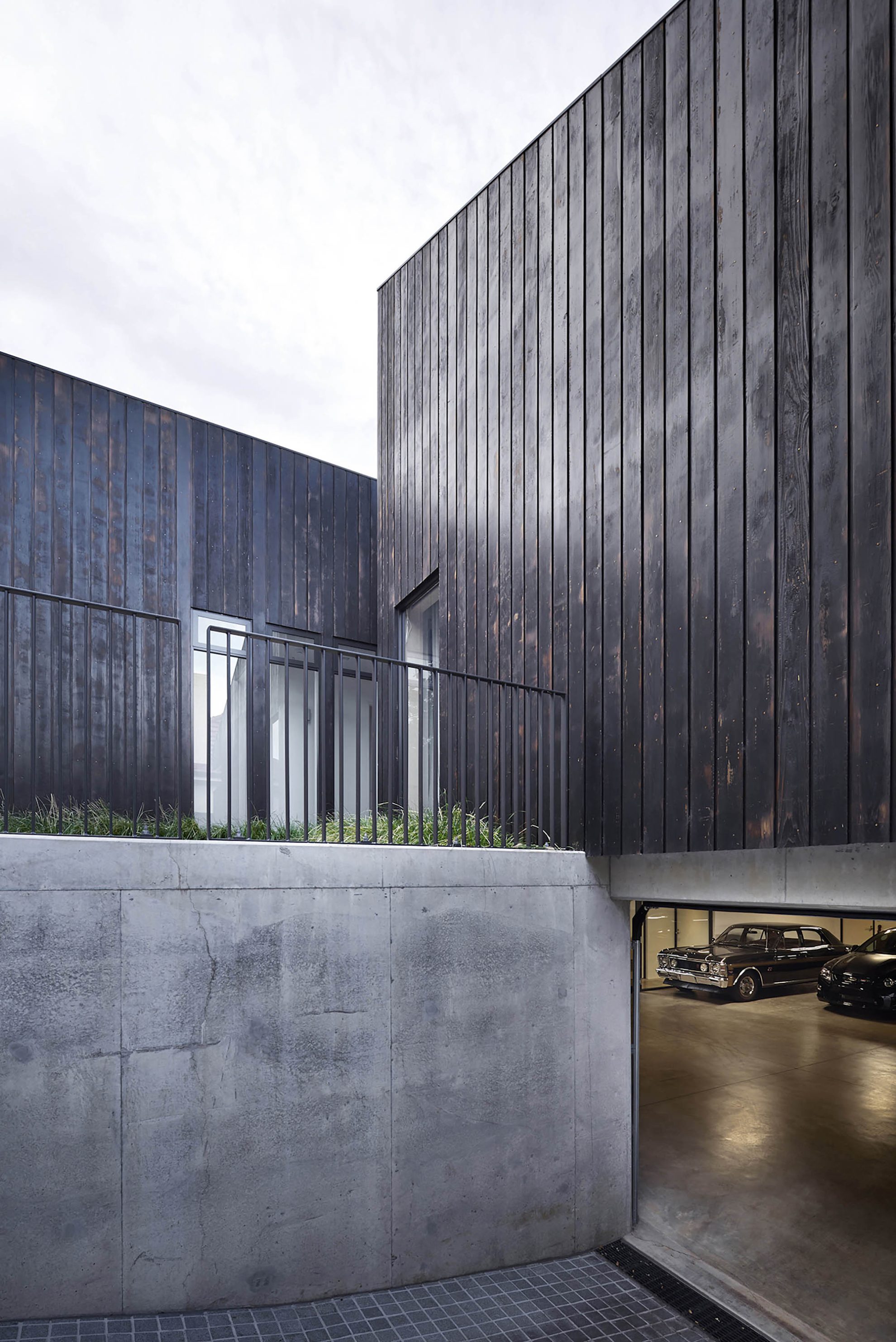 Bryłę budynku podzielono funkcjonalnie – część dziecięca oddzielona jest od prywatnych pomieszczeń rodziców. Na zewnątrz dom pokryto zwęglonym drewnem cedrowym wypalanym ręcznie na miejscu, co nadaje mu szlachetną teksturę, a zarazem pozwala wtopić się w otoczenie kamiennych domów z początku XX wieku. Wewnątrz dominuje naturalna paleta – surowy beton, biały tynk i drewno dębowe.