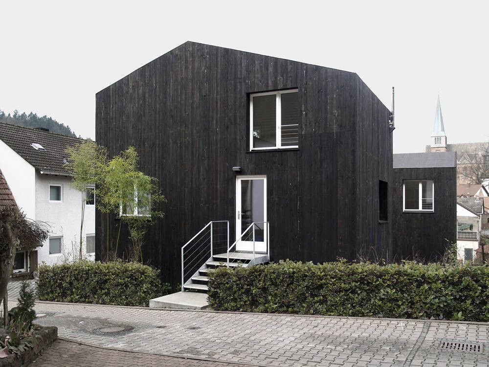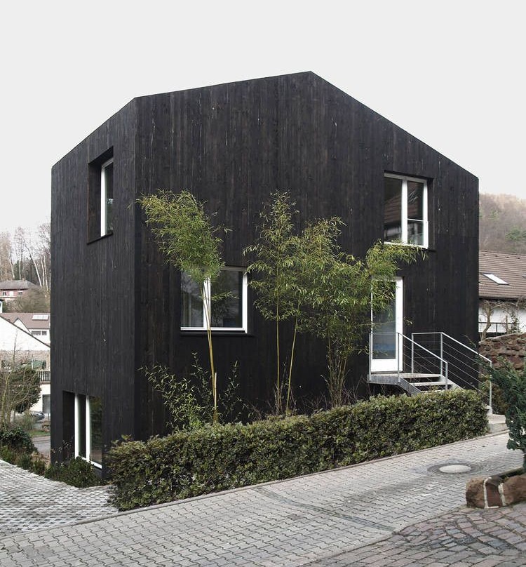 Projekt zrealizowany w Hohenecken, na przedmieściach niemieckiego miasta Kaiserslautern, obejmuje dwie kompaktowe bryły, które domykają wcześniej pustą przestrzeń urbanistyczną. Te dwie nowoczesne stodoły powstały z połączenia prefabrykowanej konstrukcji drewnianej oraz masywnych płyt z litego drewna, tworząc energooszczędne i wyraziste domy jednorodzinne. Aby maksymalnie wykorzystać walory lokalizacji i otworzyć budynki na widok pobliskiego kościoła oraz historycznego zamku, architekci odwrócili klasyczny układ funkcjonalny typowy dla zabudowy mieszkaniowej.