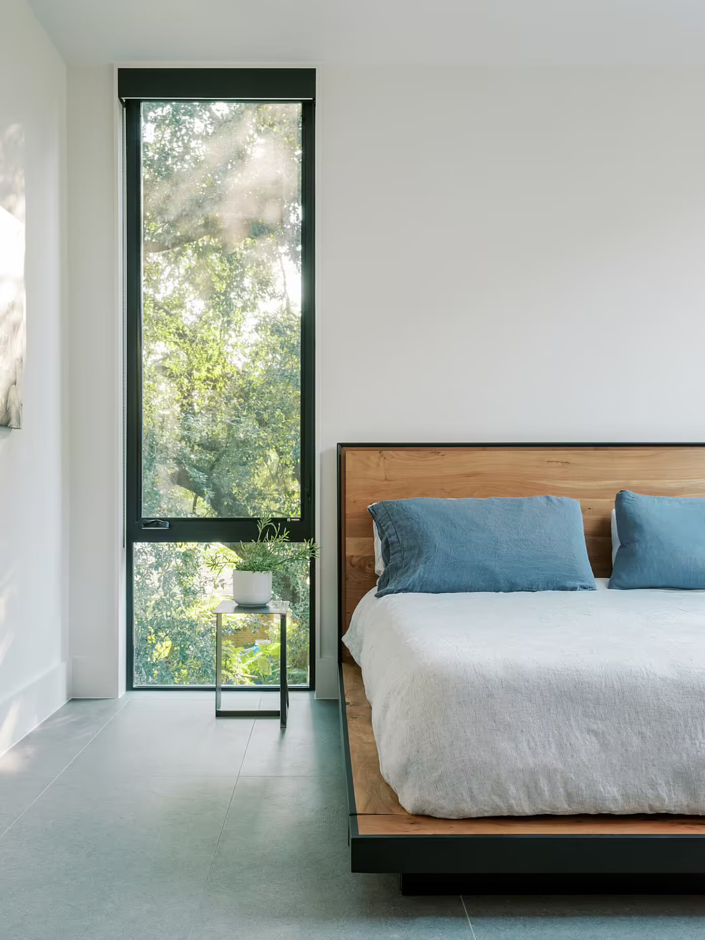 Zrównoważone projektowanie odegrało kluczową rolę. Pasywna orientacja budynku ogranicza nasłonecznienie z południa i zachodu, jednocześnie maksymalnie wykorzystując światło północne. Dzięki temu dom nie tylko minimalizuje zużycie energii, ale też oferuje piękne widoki na naturalny krajobraz. Przemyślany przedsionek wejściowy i ekranowa przesłona skutecznie oddzielają dom od miejskiego zgiełku, jednocześnie pozwalając na subtelne doświadczanie przestrzeni zewnętrznej. Wnętrza emanują spokojem – zastosowano tu beton, lokalny kamień teksański i naturalne płytki, co zapewnia trwałość, funkcjonalność i ponadczasową estetykę.