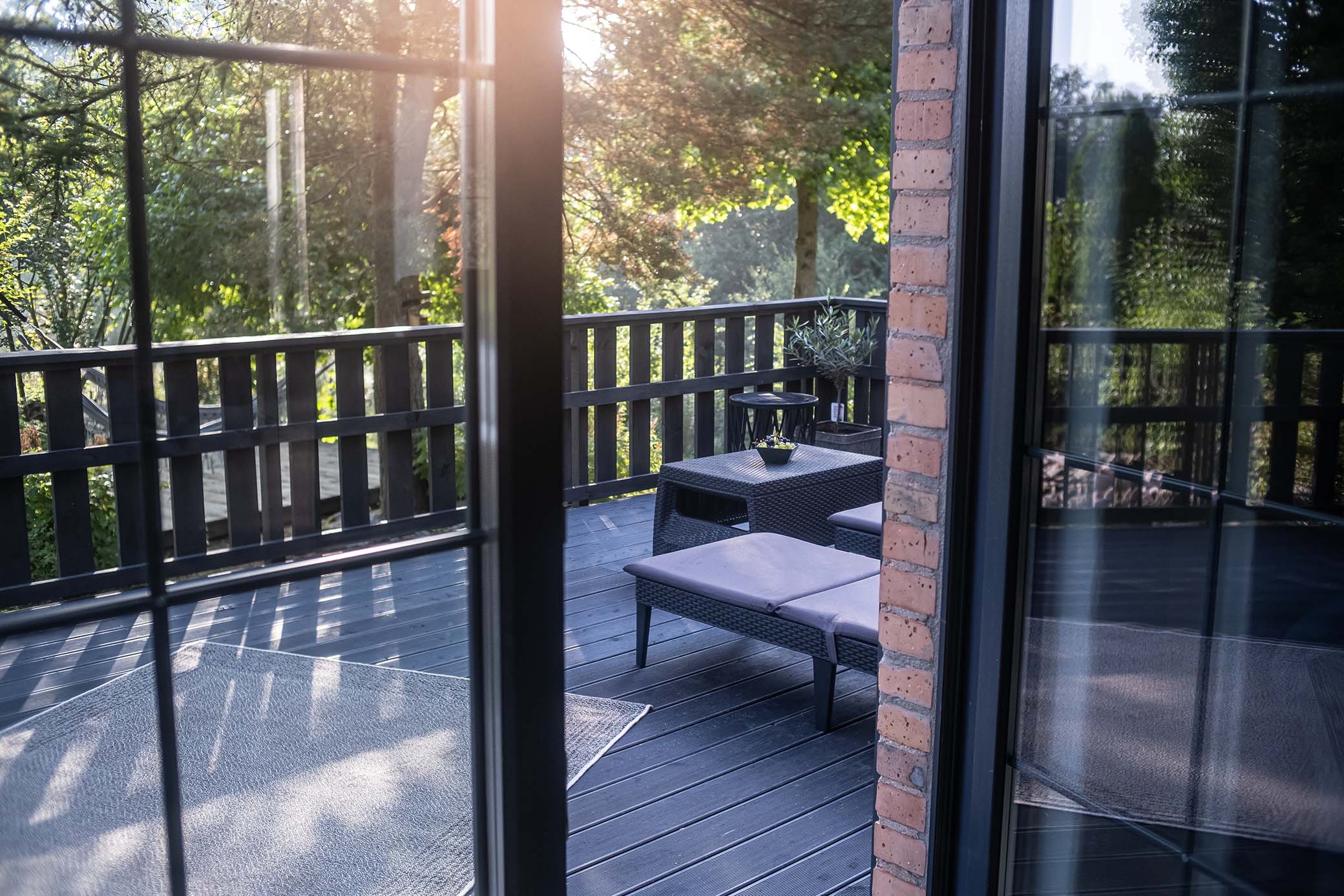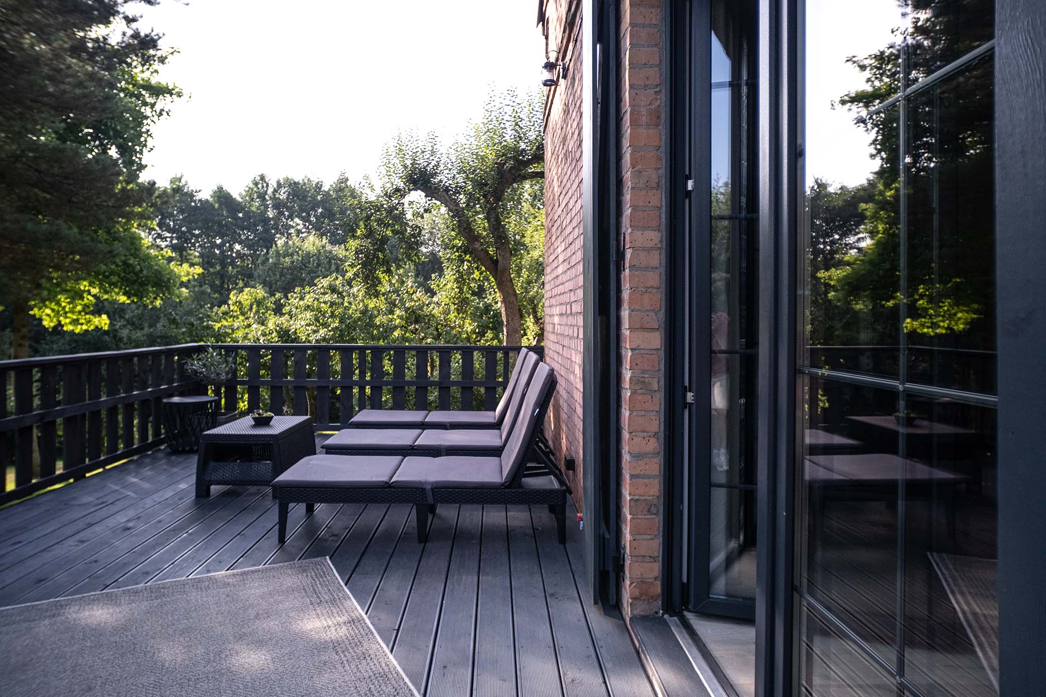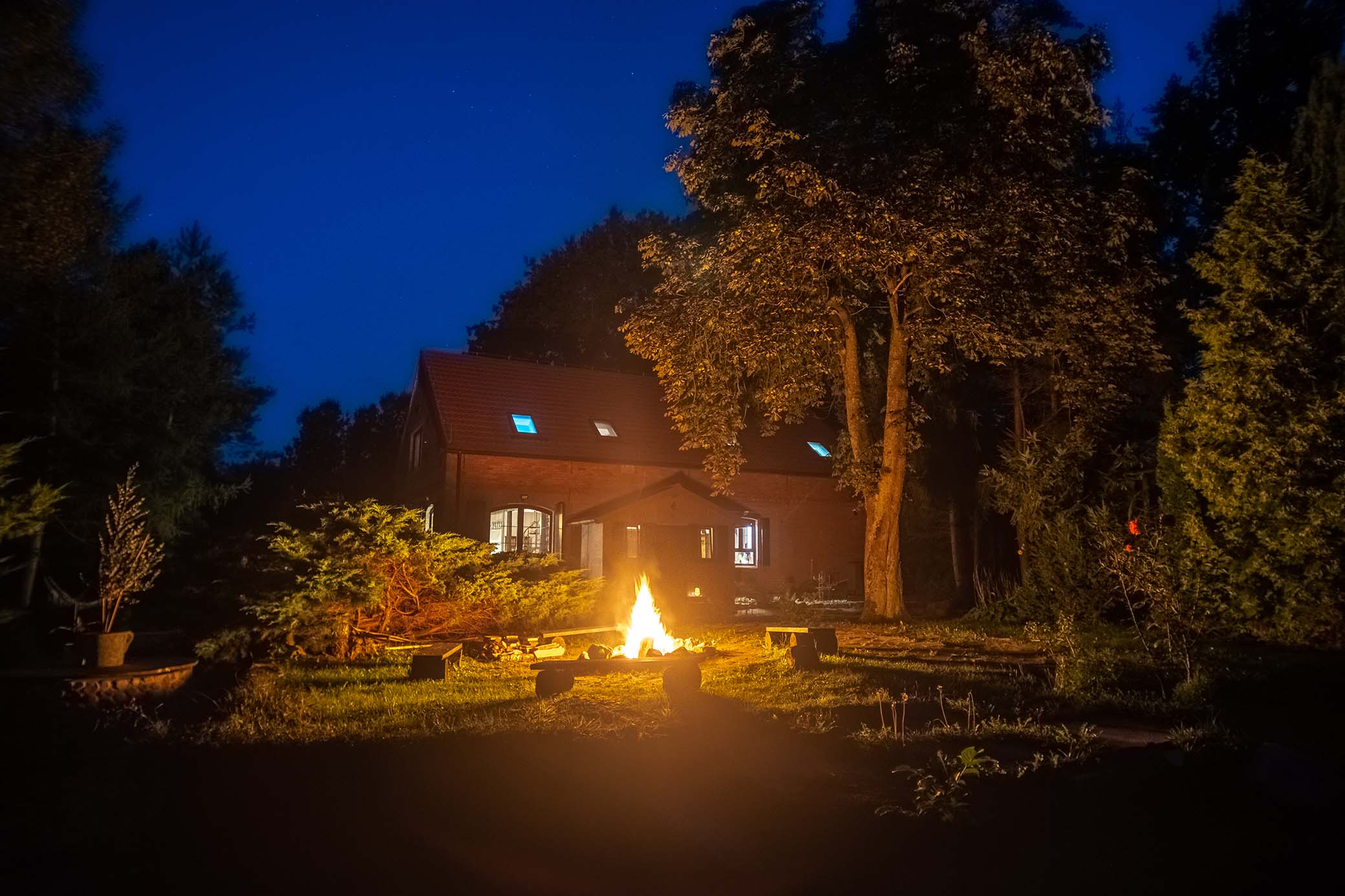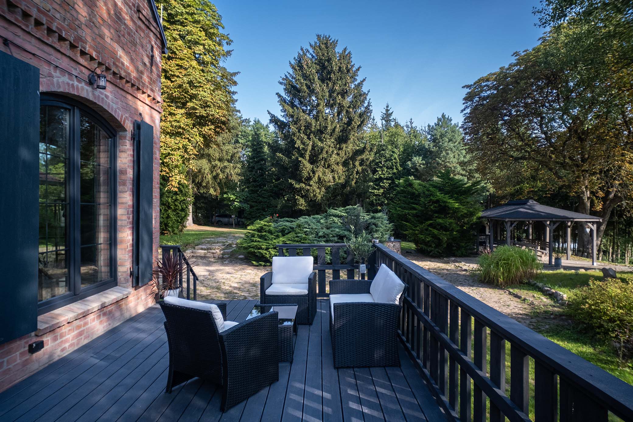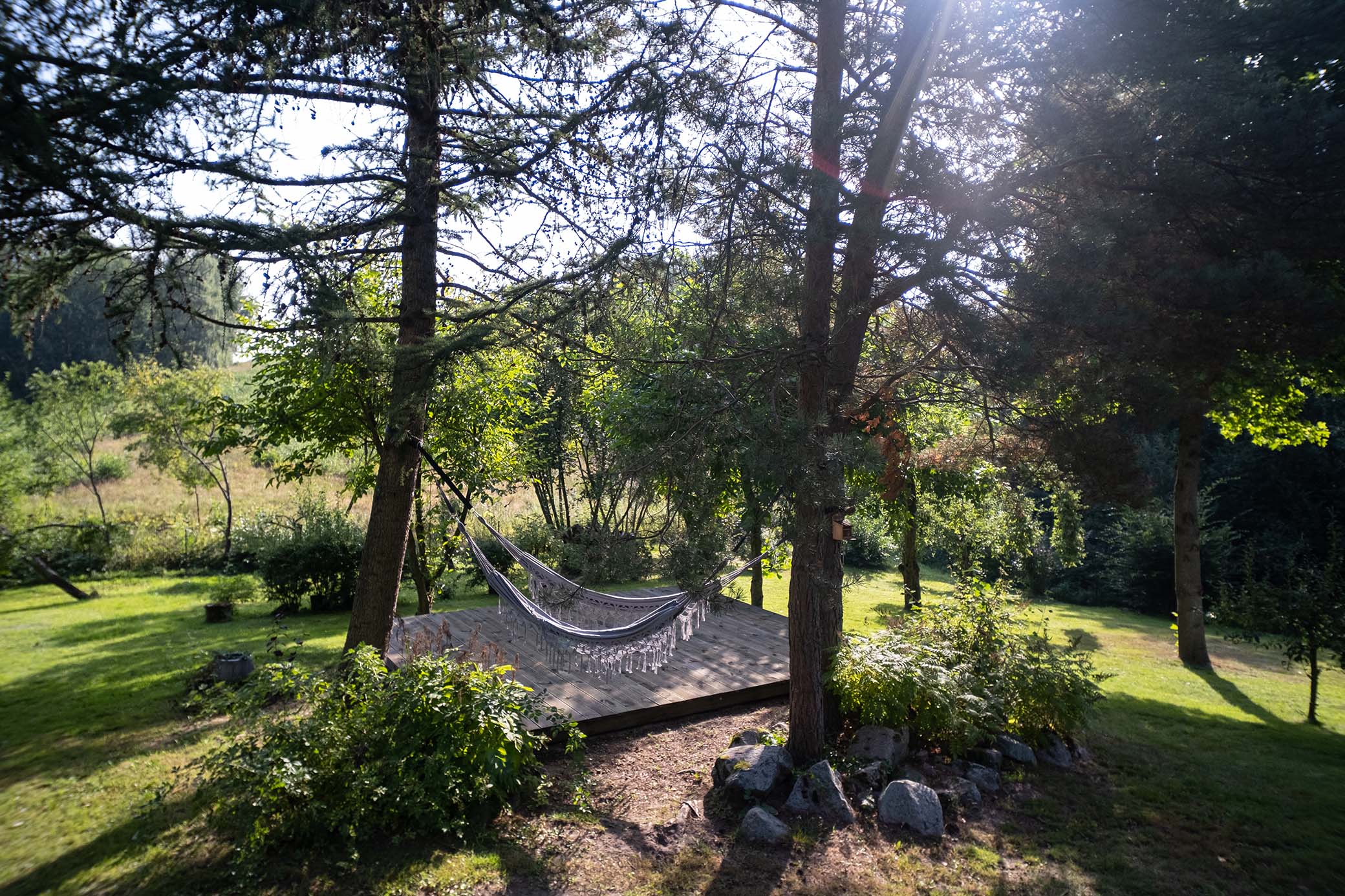 Gdy o poranku zamarzy Ci się łyk gorącej kawy, wśród otaczających drzew i śpiewu ptaków to z parteru domu wyjdziesz na duży zewnętrzny taras, na którym znajduje się miejsce do odpoczynku – komfortowe leżaki, wygodne ratanowe krzesła oraz stolik. Idąc dalej znajdziesz hamak, huśtawkę, miejsce na grilla oraz duży kominek, który zapewni ciepłą atmosferę podczas chłodniejszych wieczorów. Z działki jest również bezpośredni dostęp do jeziora oraz leśnych dróg, które pozwolą Ci odkryć piękno tego miejsca.