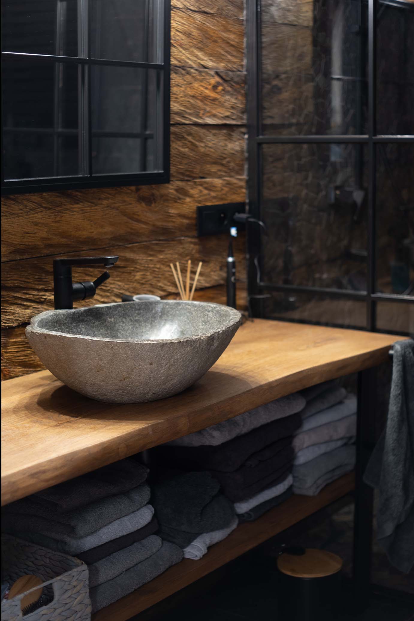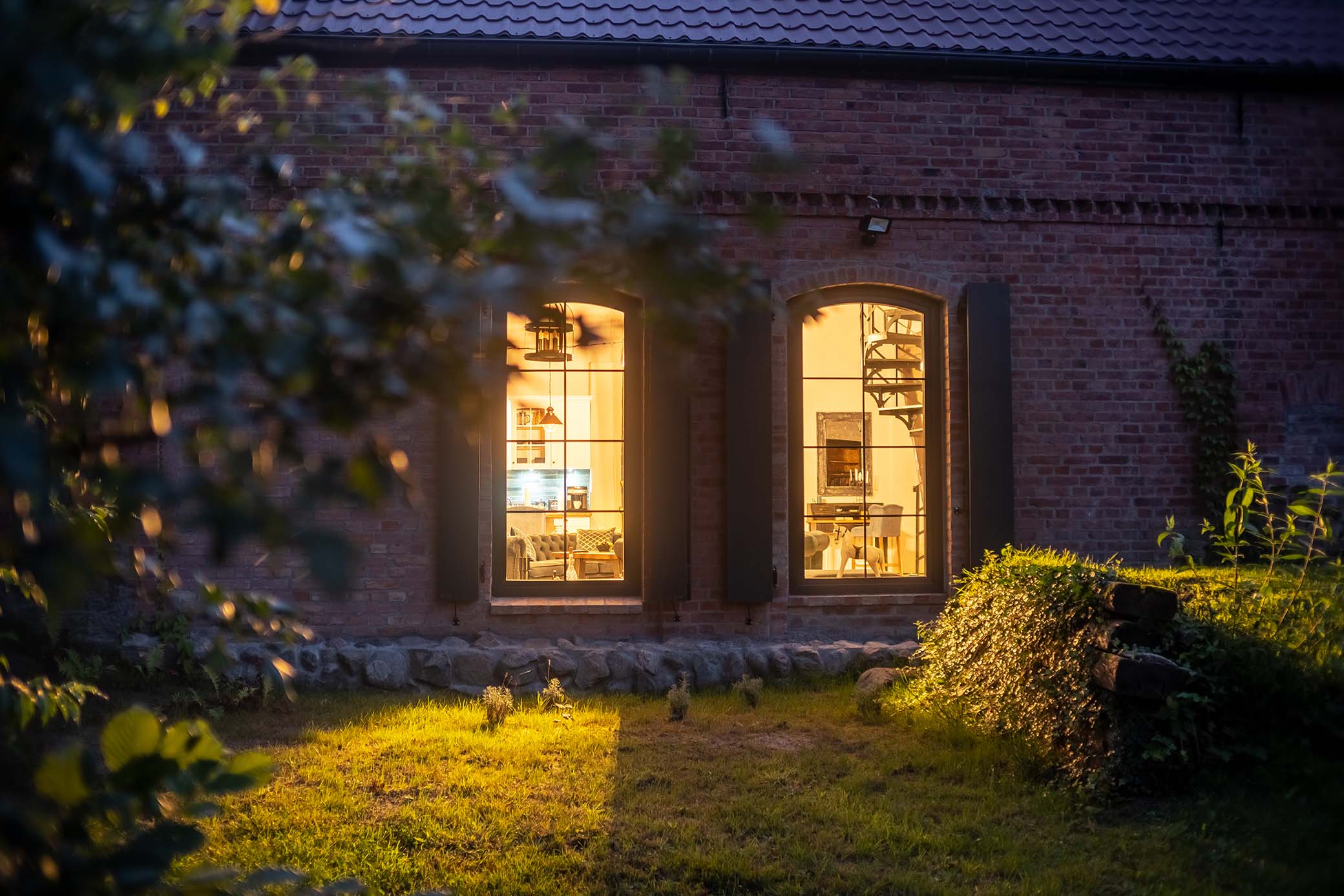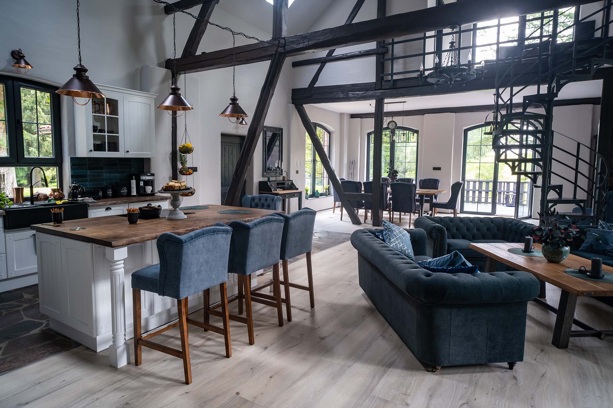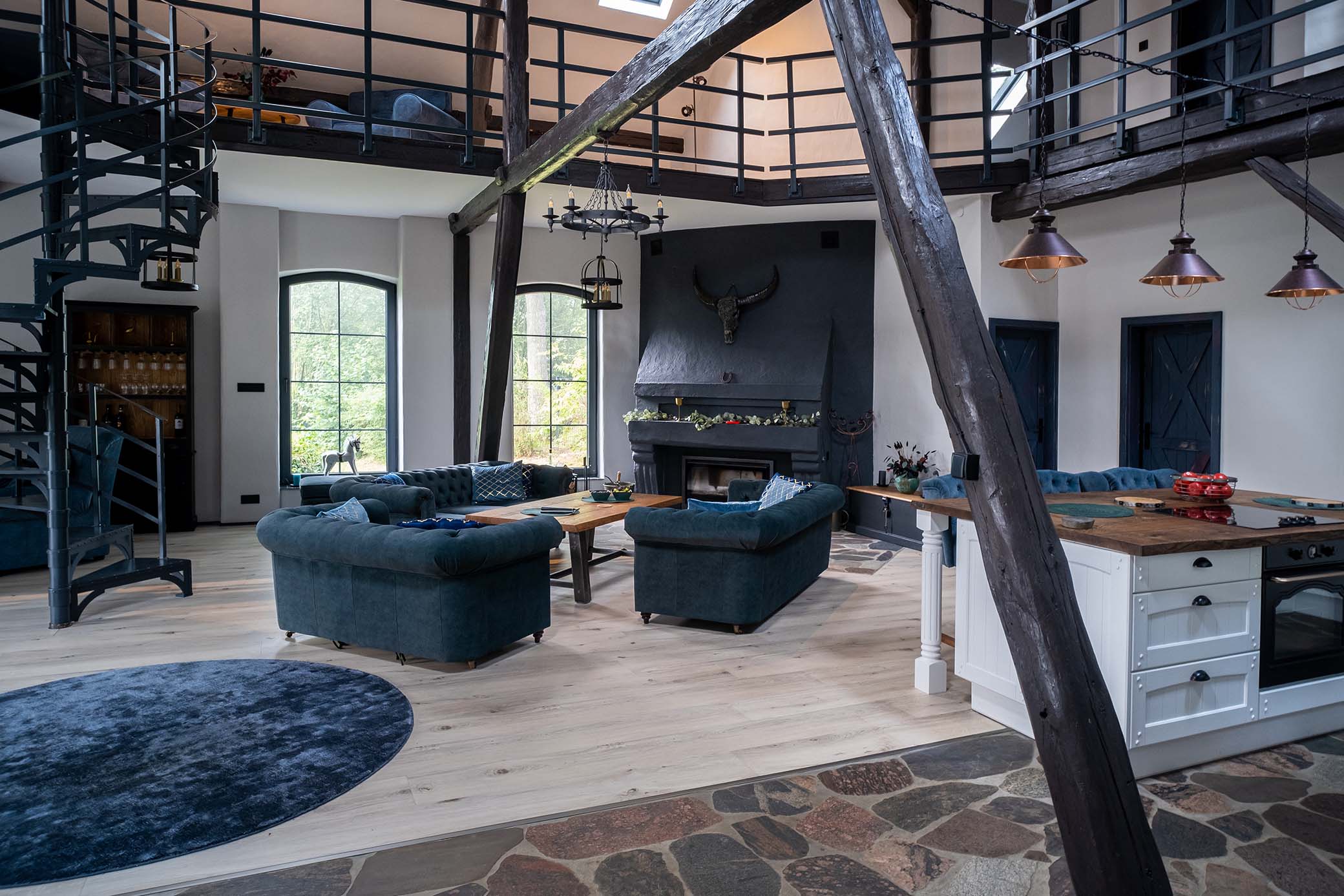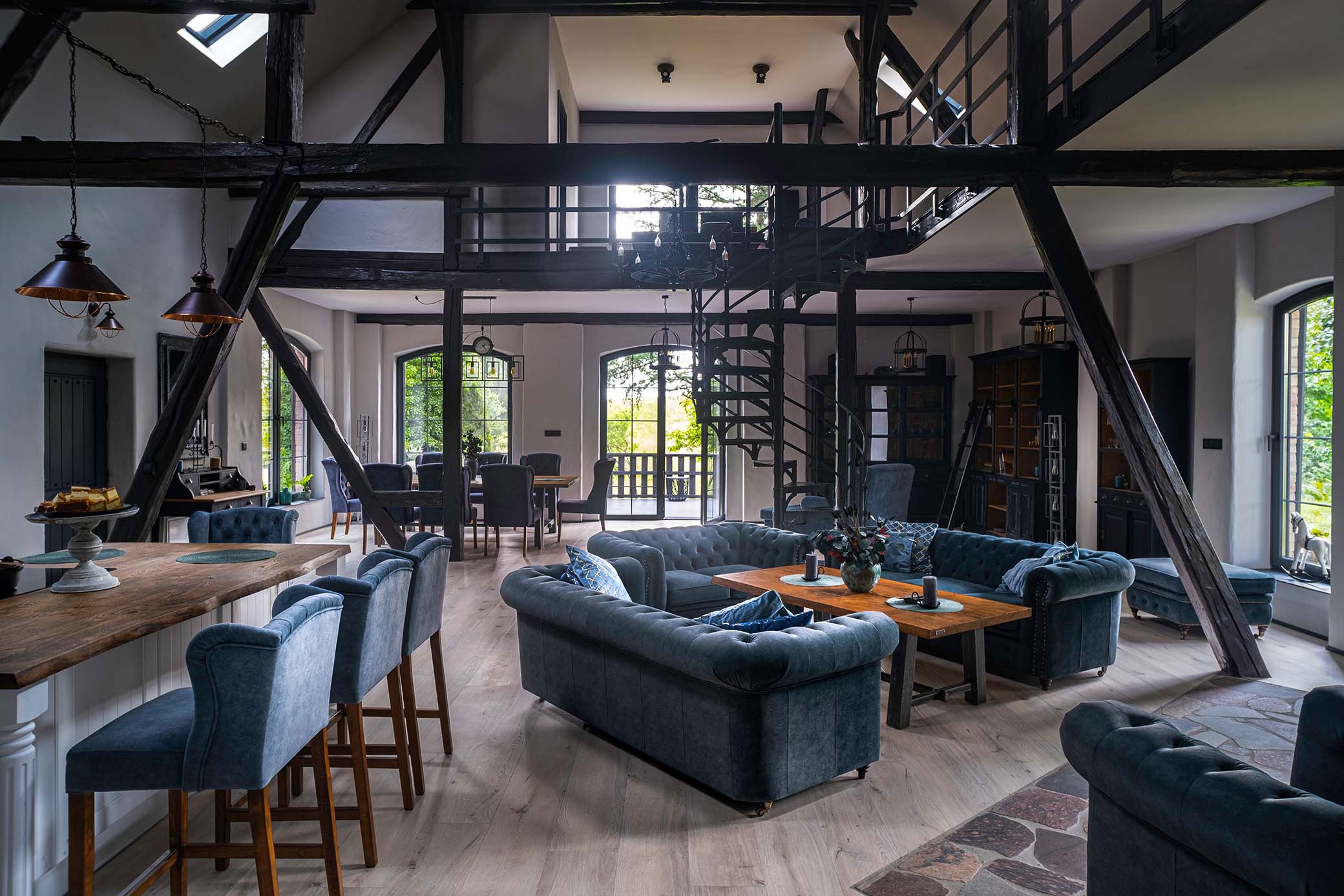 Ta nowocześnie odnowiona stodoła w stylu loftowym łączy w sobie miejsce zarówno do pracy, jak i do odpoczynku. Na parterze domu znajduje się duża otwarta przestrzeń połączona ze stylowo wykończonym aneksem kuchennym, sypialnia oraz przestronna łazienka z sauną. Na piętrze umieszczono 3 dwuosobowe pokoje, przestrzeń biurową oraz drugą łazienkę, a oba piętra połączono modułowymi kręconymi schodami w stylu loftowym. Całe wnętrze tworzy surowy, a jednocześnie nowoczesny styl, który idealnie wpasował się charakterystykę tego miejsca.